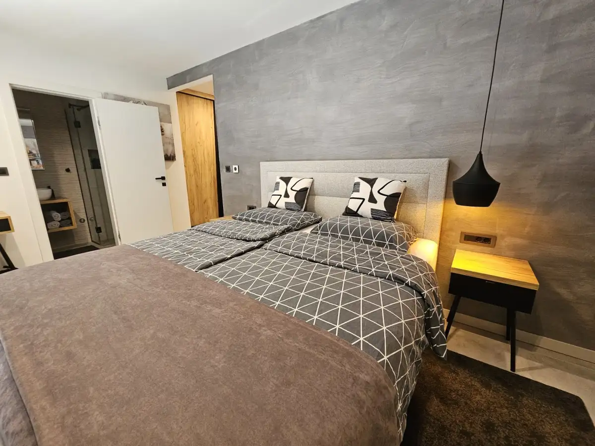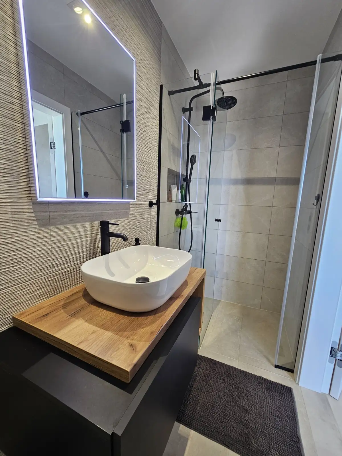 V přízemí se nachází prostorné zádveří, hostinská koupelna, prádelna, moderní kuchyně s jídelní částí a elegantní obývací pokoj, ze kterého je přímý vstup na krytou lodžii s výhledem do zahrady a na bazén. V patře jsou tři ložnice, přičemž hlavní „master“ disponuje vlastní koupelnou, šatnou a terasou. Další dvě ložnice mají vlastní terasy a sdílenou koupelnu. Každý detail interiéru je proveden v nejvyšší kvalitě, s důrazem na moderní design a funkčnost.