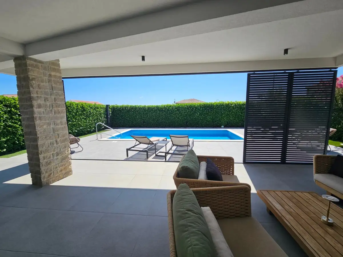 K domu náleží upravená zahrada s prosluněnou terasou a vyhřívaným bazénem, ideální pro relaxaci a nerušené soukromí. Vila je vybavena podlahovým vytápěním v celém objektu a klimatizací v každé místnosti, energetická třída A+ garantuje nízké provozní náklady.