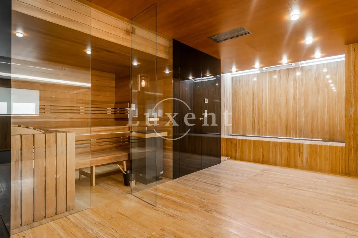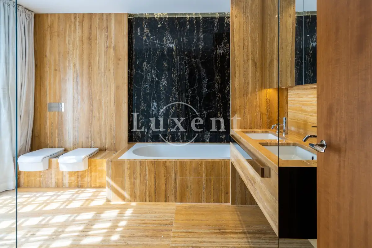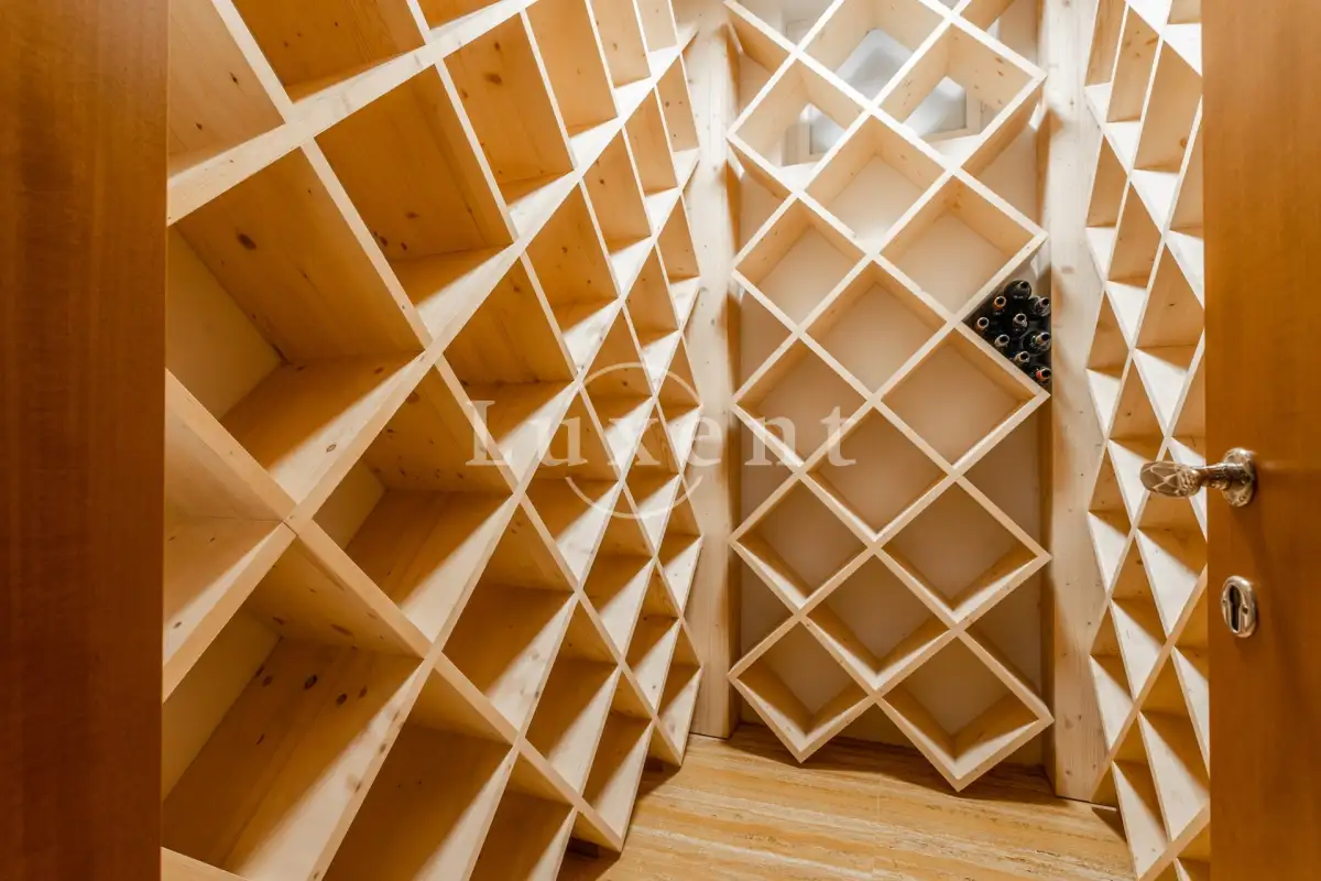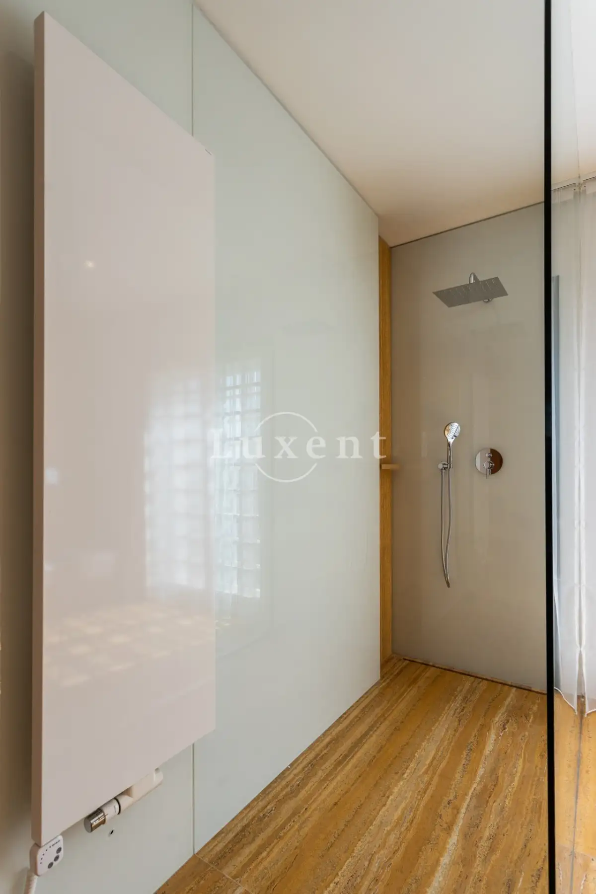 Obytná plocha má celkovou výměru 388 m2 ve čtyřech podlažích: v nejnižším patře domu poslouží majitelům wellness prostory s vestavěným bazénem 10x3 m a vodním chrličem (64,9 m2), finskou saunou (4,6 m2) a relaxačním zázemím, klimatizovanou vinotékou (6 m2), a také technickým zázemím s prádelnou (16,7 m2). První nadzemní patro je koncipováno jako společenské obytné s hlavním vchodem do domu. Přes zádveří s šatnou (3,4 m2) a centrální chodbu s toaletou a schodištěm se za velkoplošnými dveřmi otevírají prostory obývacího pokoje s krbem (38 m2), a jídelnou s kuchyní (42,4 m2) a spíží. Z jídelního pokoje je vchod na terasu (12,7 m2). Druhé nadzemní ložnicové patro je rozděleno na dvě části: hlavní ložnici (17,5 m2) s šatnou (6,1 m2) a koupelnou (13,6 m2), a další dvě ložnice (21,3 a 17,5 m2) které mají k dispozici společnou koupelnu (5,5 m2). Pro dvě z ložnic je východ na venkovní terasu (23,5 m2). Ve třetím nadzemním patře je atelier (15,9 m2) s koupelnou (5,9 m2) a největší terasou (87,4 m2) s panoramatickými výhledy do okolí na Pražský hrad, Vyšehrad a celé Podolí.