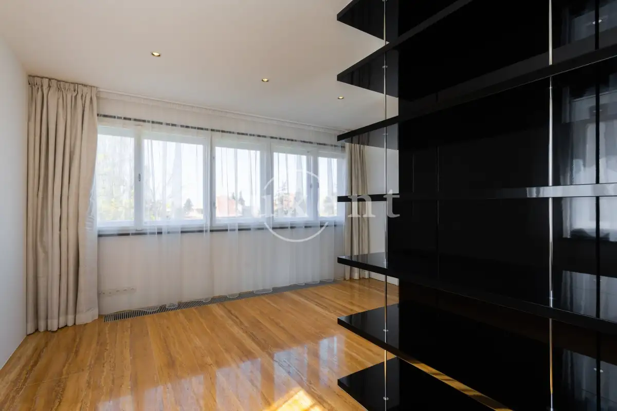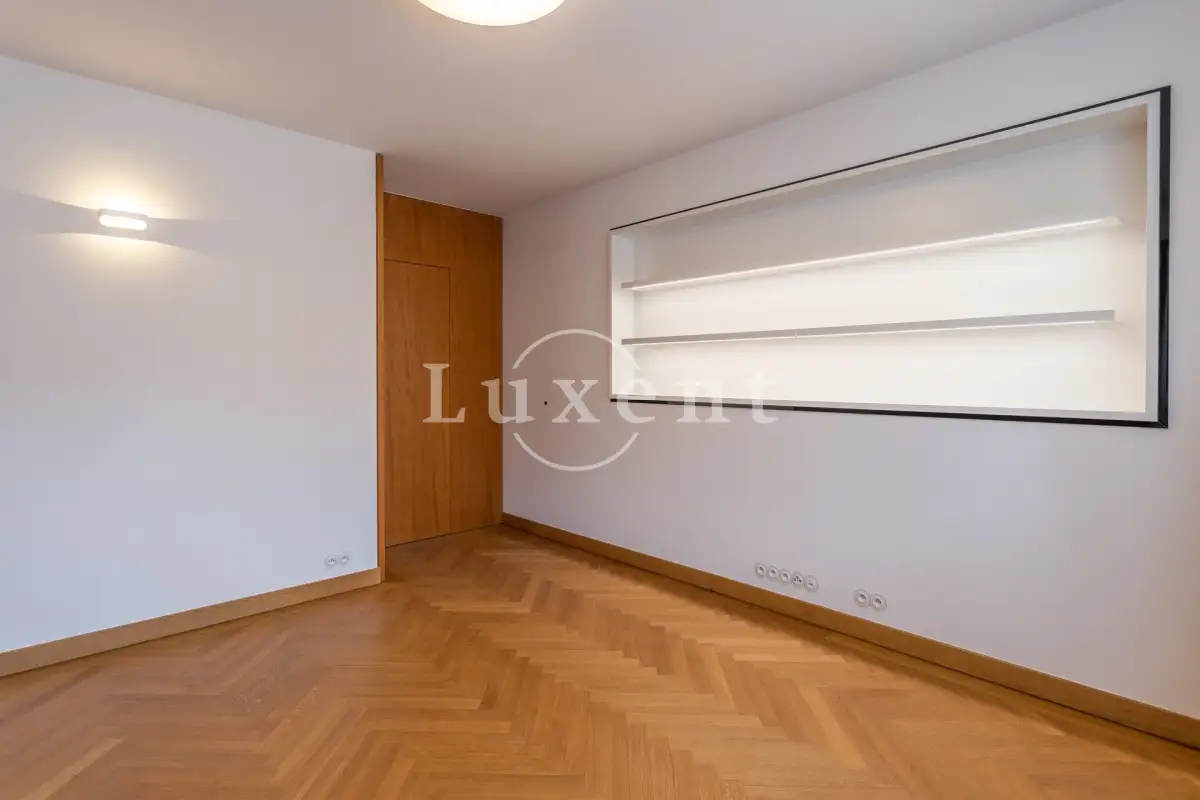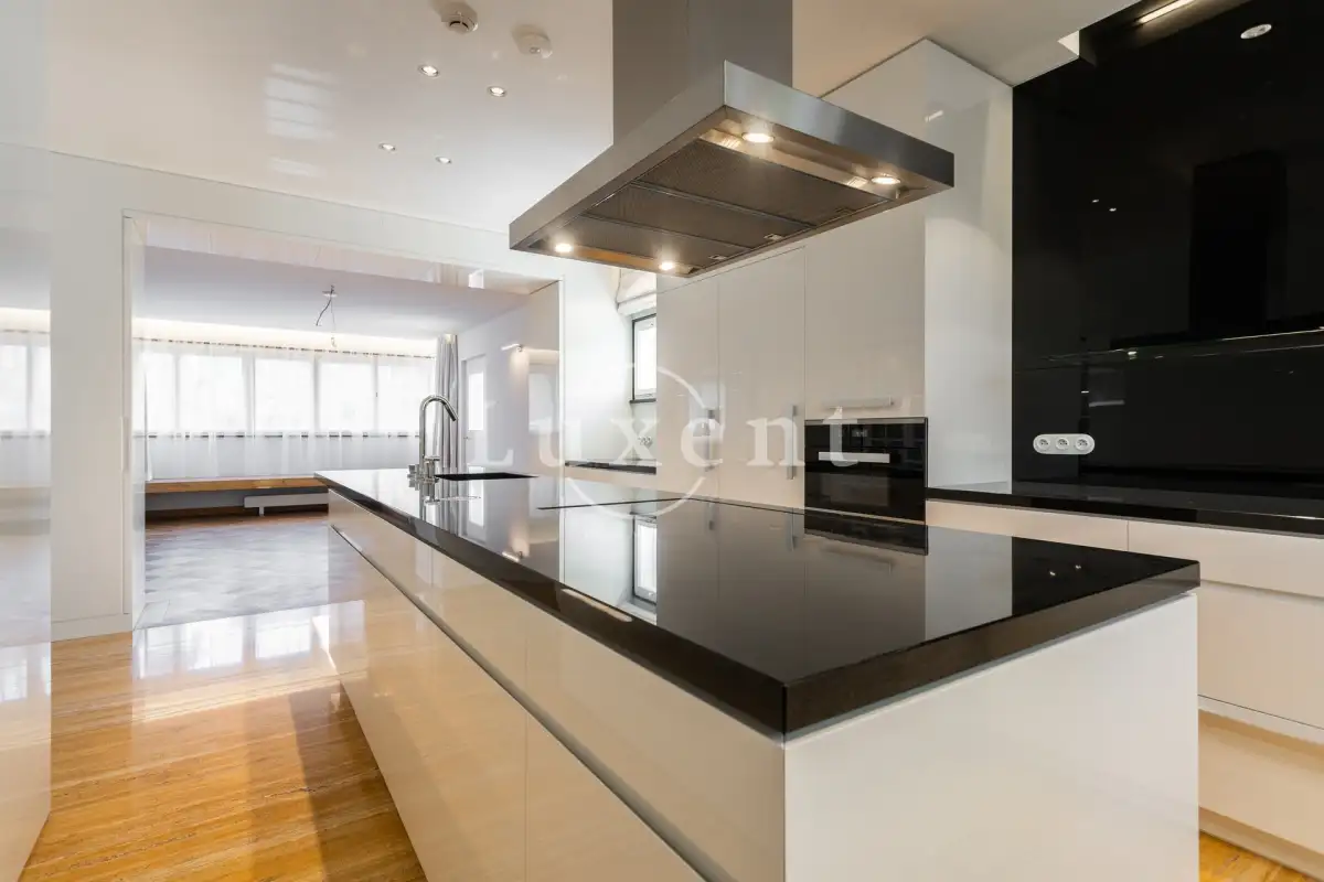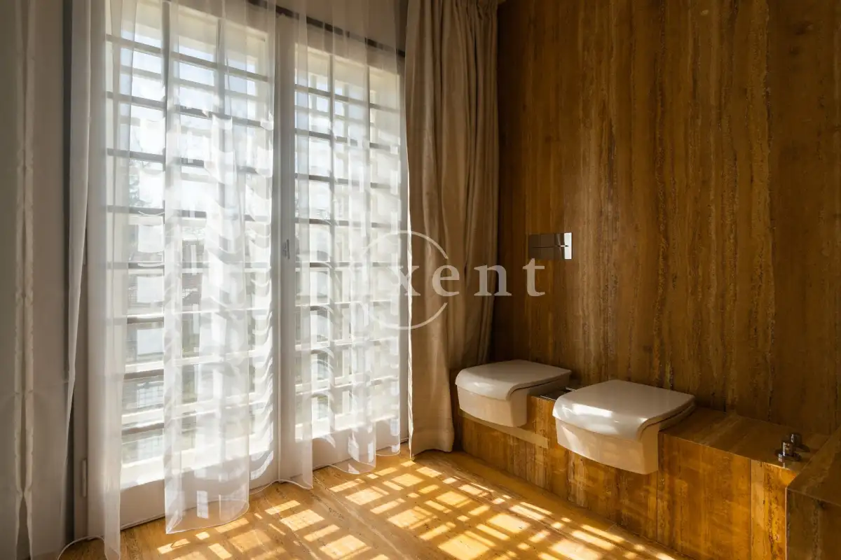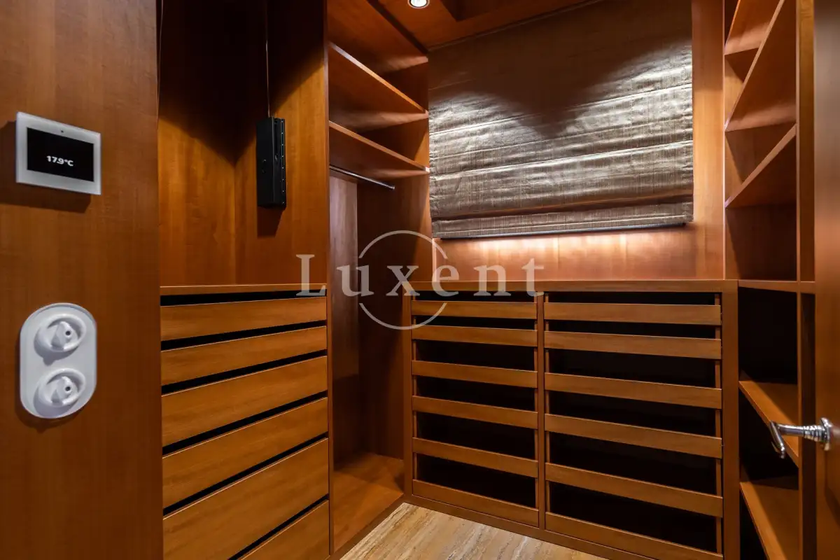 Obytná plocha má celkovou výměru 388 m2 ve čtyřech podlažích: v nejnižším patře domu poslouží majitelům wellness prostory s vestavěným bazénem 10x3 m a vodním chrličem (64,9 m2), finskou saunou (4,6 m2) a relaxačním zázemím, klimatizovanou vinotékou (6 m2), a také technickým zázemím s prádelnou (16,7 m2). První nadzemní patro je koncipováno jako společenské obytné s hlavním vchodem do domu. Přes zádveří s šatnou (3,4 m2) a centrální chodbu s toaletou a schodištěm se za velkoplošnými dveřmi otevírají prostory obývacího pokoje s krbem (38 m2), a jídelnou s kuchyní (42,4 m2) a spíží. Z jídelního pokoje je vchod na terasu (12,7 m2). Druhé nadzemní ložnicové patro je rozděleno na dvě části: hlavní ložnici (17,5 m2) s šatnou (6,1 m2) a koupelnou (13,6 m2), a další dvě ložnice (21,3 a 17,5 m2) které mají k dispozici společnou koupelnu (5,5 m2). Pro dvě z ložnic je východ na venkovní terasu (23,5 m2). Ve třetím nadzemním patře je atelier (15,9 m2) s koupelnou (5,9 m2) a největší terasou (87,4 m2) s panoramatickými výhledy do okolí na Pražský hrad, Vyšehrad a celé Podolí.