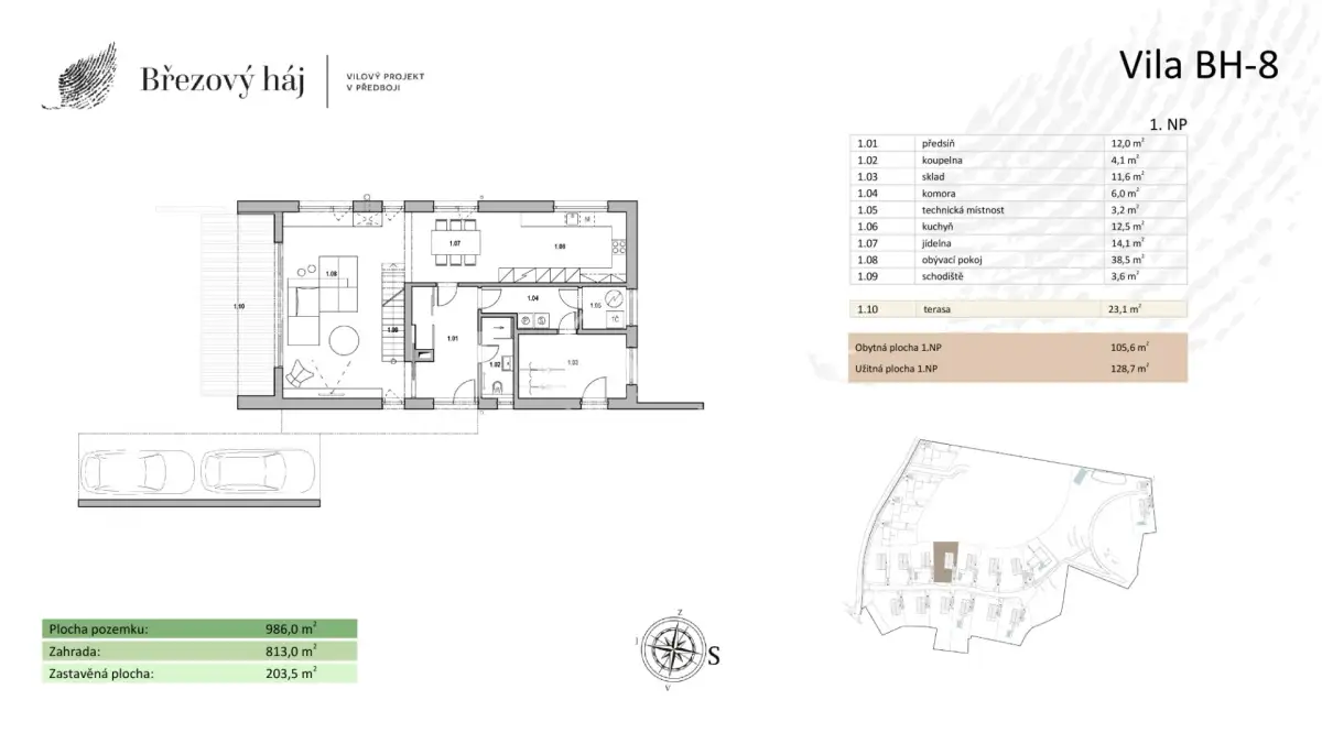 Nabízíme exkluzivně prodej rodinného domu se zahradou v centru oblíbené obce s golfovým hřištěm – Předboj, Praha-východ. Lokalita je situována do krásné středočeské zvlněné krajiny s listnatými lesy a rybníky (přímo v obci hned dva). Dům má celkovou užitnou plochu 238,2 m2, z toho plocha terasy činí 23,1 m2 a lodžie 11,6 m2. K domu náleží carport pro dva vozy a venkovní pro další dva. Pozemek je o rozloze 986 m2, z toho zastavěná plocha (včetně garáže a zpevněných ploch) činí 188,8 m2, zahrada 797,2 m2. Vila je součástí nově vznikajícího moderního vilového resortu Březový háj. Jedná se o projekt devatenácti moderních vil, jehož záměrem je nabídnout kvalitní a krásné místo ke spokojenému životu, blízko Praze i přírodě.