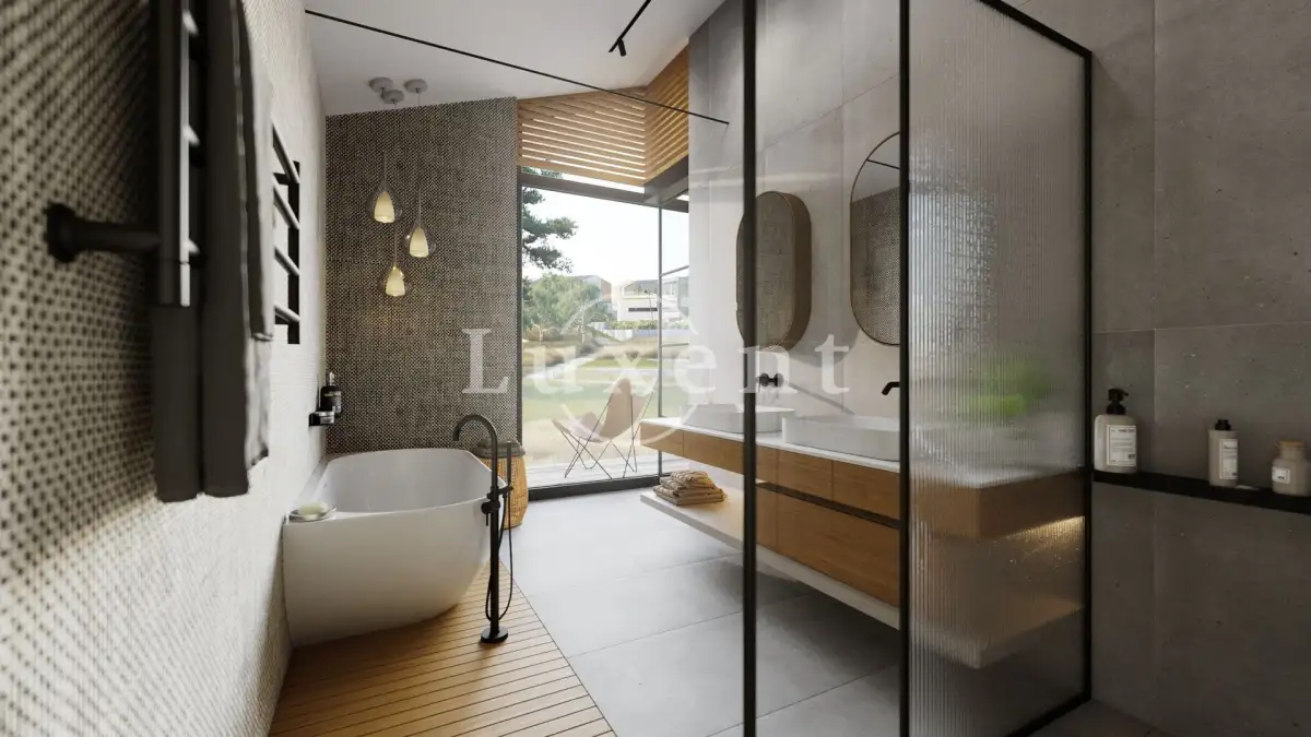 Vila je dvoupodlažní, nepodsklepená, s dvoumístným krytým stáním. V přízemí je společenská část s kuchyní a terasou, pracovna, koupelna, úložné prostory. V horním patře jsou pak 3 ložnice s terasou. V domě jsou tři koupelny.