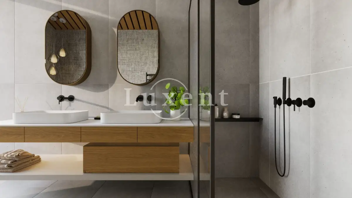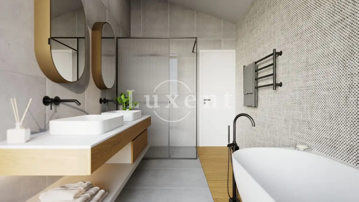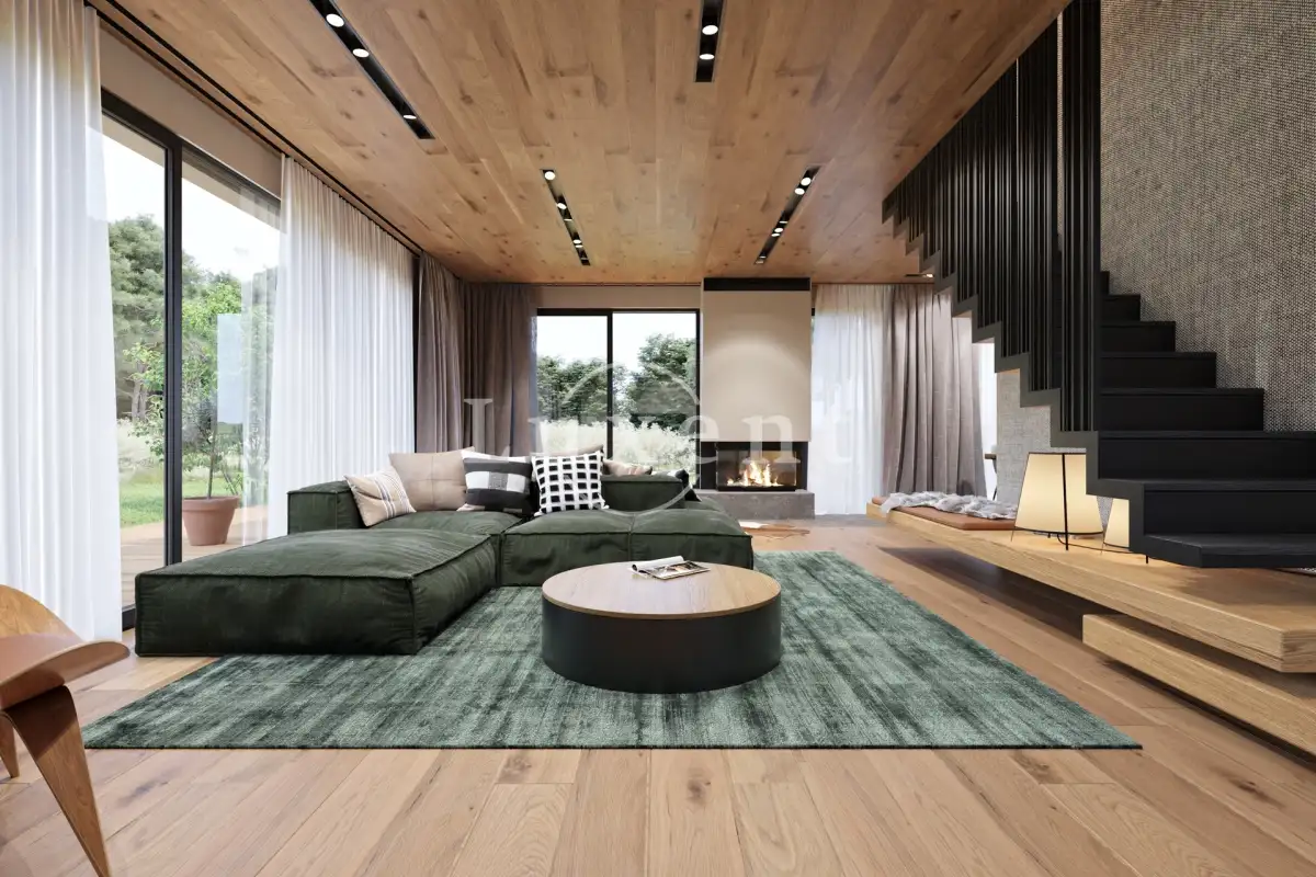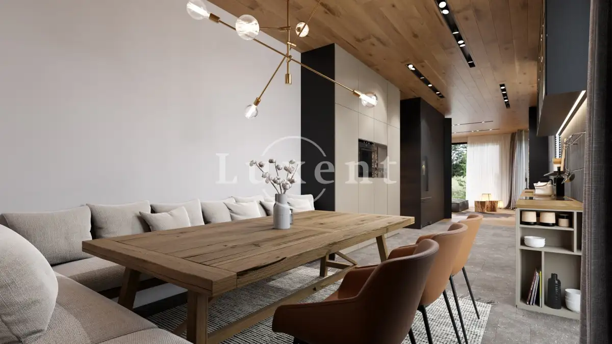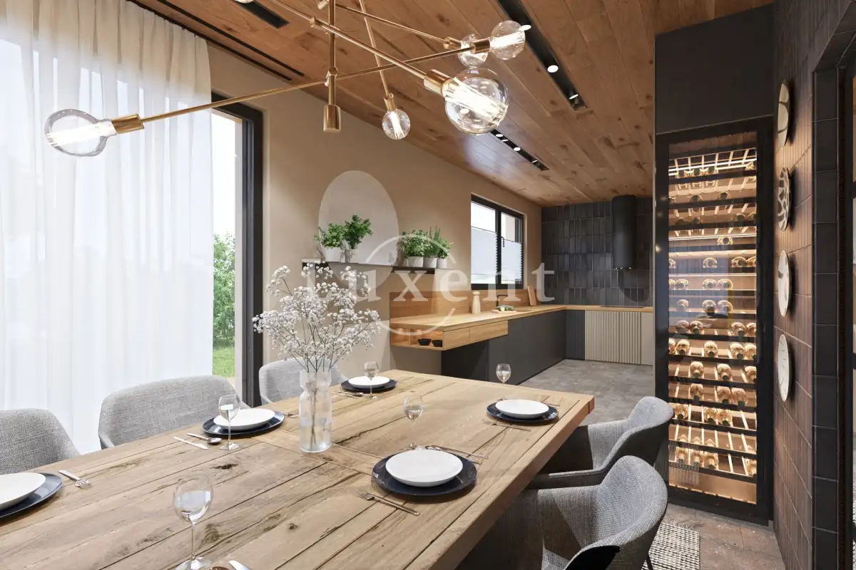 Dům je postaven z kvalitních materiálů. Plášť tvoří cihlové bloky POROTHERM (44 Profi), příčky cihlové Porotherm Wienerberger. Střecha Ruukki Classic – špičková ocelová střecha s nevšedním vzhledem, jejíž profil připomíná tradiční falcované krytiny. Okna na čele domu v obou patrech jsou hliníková (HS portál), ostatní okna trojskla, kvalitní plastová v antracitu v tónu střechy se zabudovanou schránkou a přípravou na okenní žaluzie či rolety. Interiérové dveře od firmy Prüm, vstupní dveře hliníkové prosklené, antracit, trojsklo. Na fasádě je strukturovaná omítka. Vytápění a chlazení domu tepelným čerpadlem Vaillant (země – voda) s integrovaným zásobníkem teplé užitkové vody. Podlahové topení a chlazení Rehau. V domě je příprava na FVE. Energetická třída domu je B – velmi úsporná. Na zahradě je vybudována retenčení nádrž na dešťovou vodu. Luxusní zařízení koupelen je od firem Villeroy&Boch, Steinberg, Light. V obytných místnostech je položena dřevěná třívrstvá podlaha Dub rustikální Authentik, přírodní, kartáčovaný, úprava olej, od firmy Meister, a velkoformátová rect. dlažba je položena na chodbách a v koupelnách. Dům je řízen chytrým systémem od firmy LOXONE. Je zde příprava na domovní el. zabezpečovací systém a dobíjení elektromobilů. Je zde domovní vrátný s kamerou. Vjezdová brána je na el. Pohon s dálkový ovládáním.