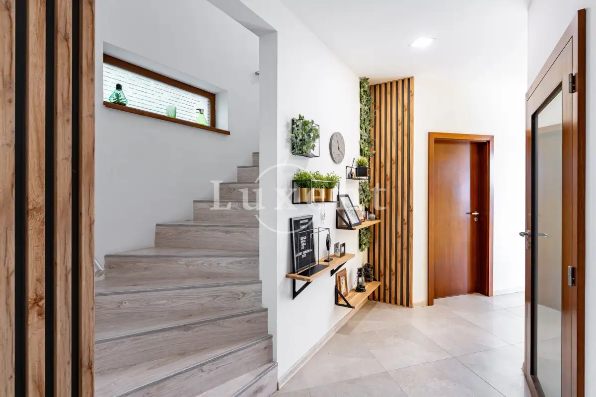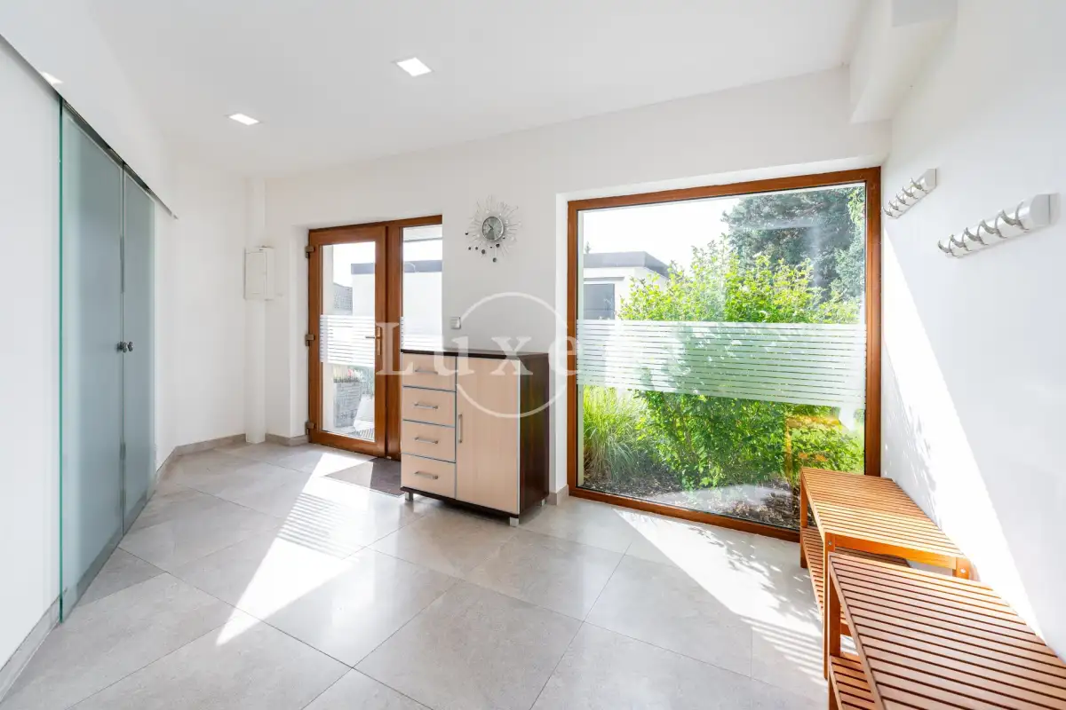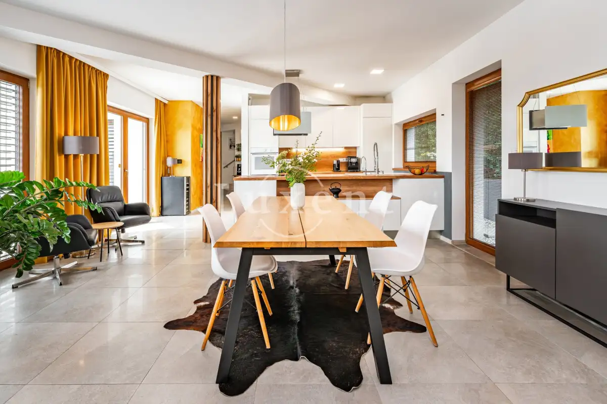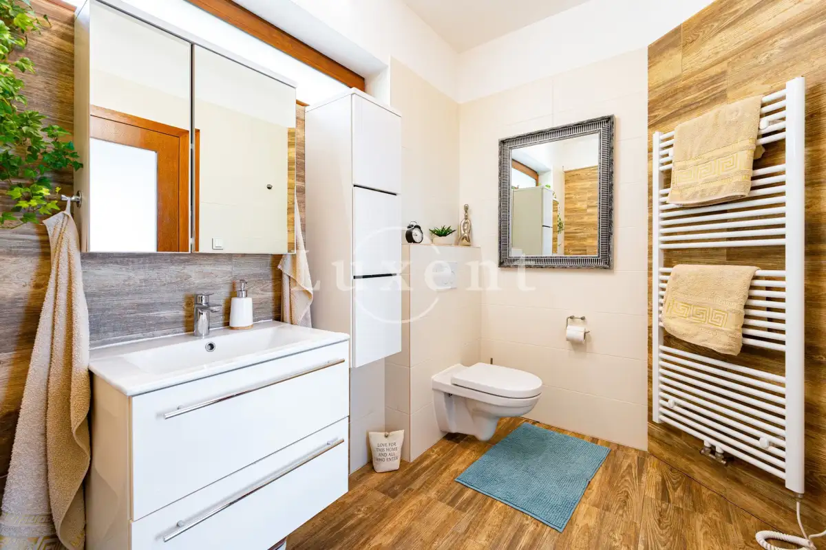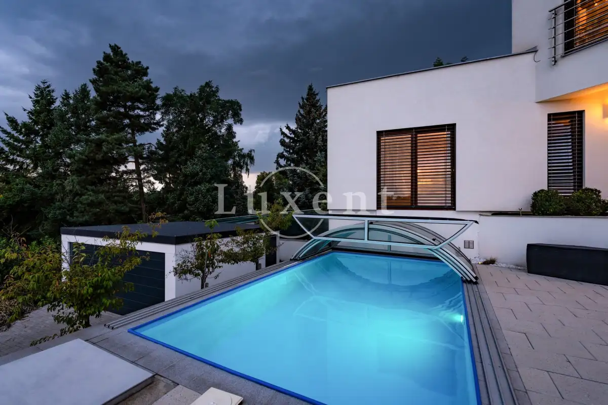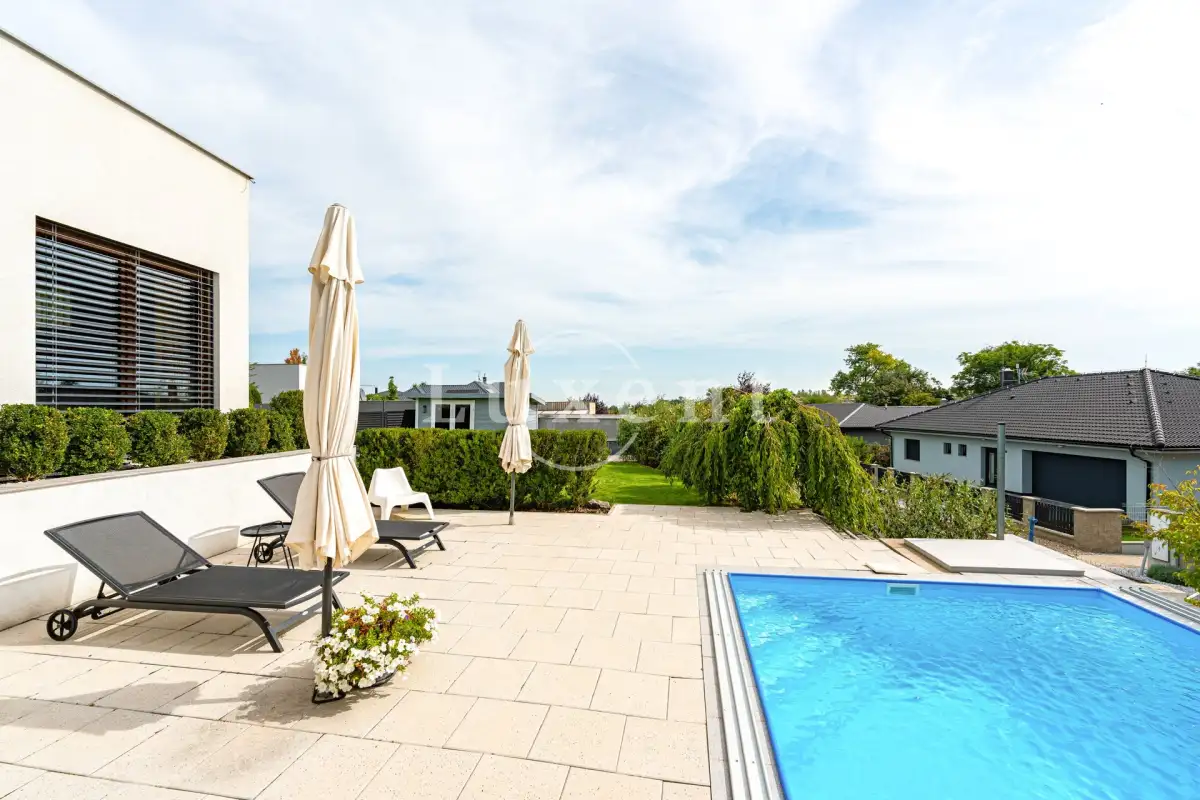 V 1. NP se nachází velmi prostorná předsíň se vstupem do oddělené šatny. 2.NP nabízí pokoj pro hosty s klimatizací (13,7 m2), koupelnou, šatnou (8,7 m2) a úchvatným výhledem na bazén. Dále dětský pokoj o velikosti 9,3 m2 a technickou místnost s toaletou. Součástí 2.NP je velkorysý obývací pokoj s krbem, jídelnou, kuchyní a to vše o velikosti 43,6 m2. Kuchyňská linka HANÁK má veškeré vestavěné spotřebiče, indukční desku, el. troubu s grilem, lednici, myčku a drtič odpadu. Z obývacího pokoje je vstup na severní i jižní terasu. Severní terasa má výsuvnou elektrickou markýzu s čidlem, které automaticky stáhne markýzu při velkém větru, bio krb a posezení v úplném soukromí s výhledem do zahrady. Jižní terasa nabízí naopak slunné posezení a příjemný relax u bazénu o velikosti 6x3 metrů, který má slanou vodou a zastřešení. V 3.NP je hlavní ložnice (15,9 m2) se šatnou (2,3 m2), dětský pokoj (15,6 m2) a koupelna s toaletou. Toto patro má v pokojích klimatizace. Výhledy z tohoto podlaží jsou ohromující.