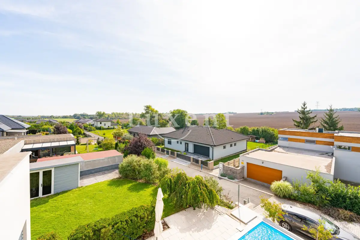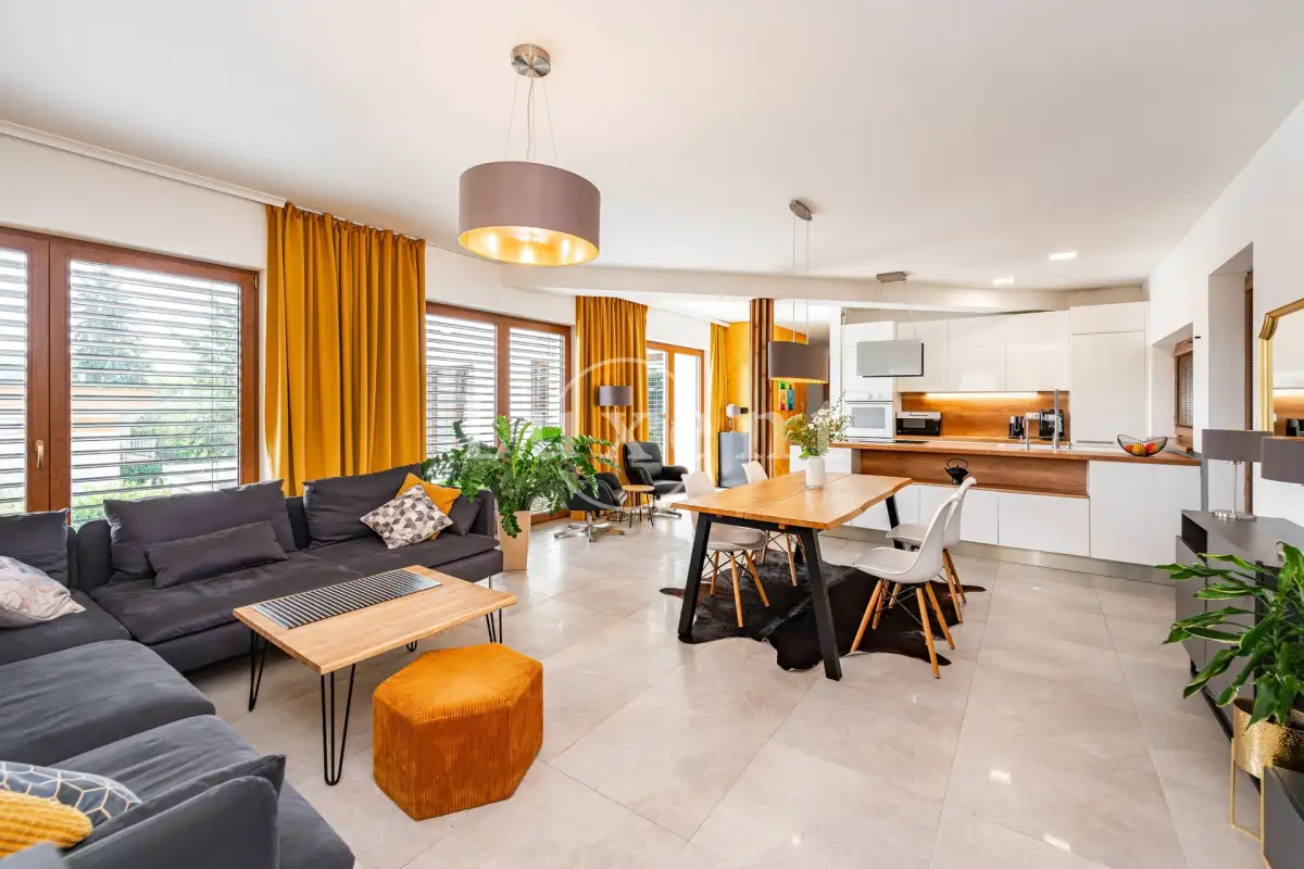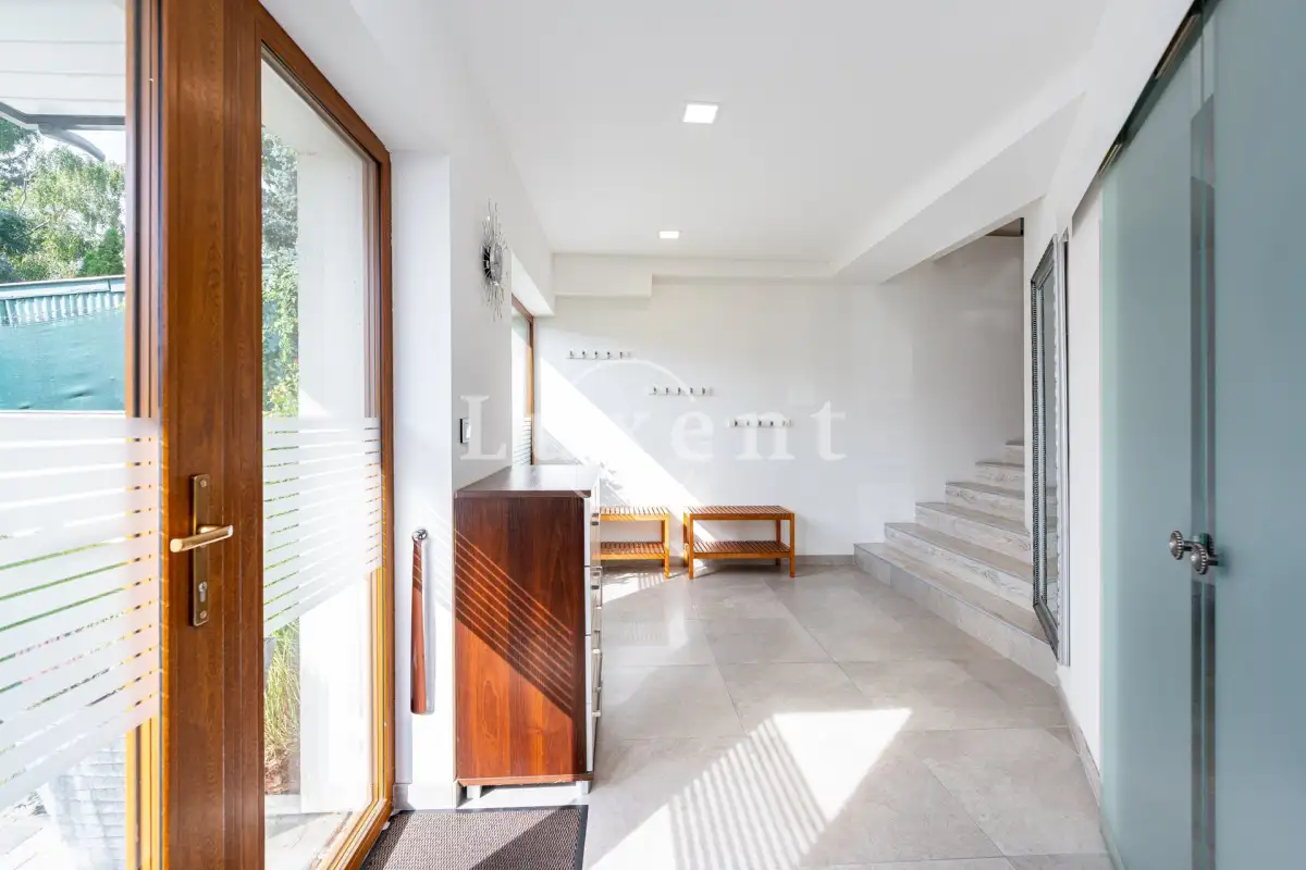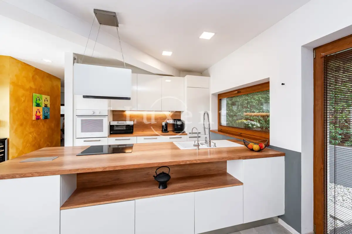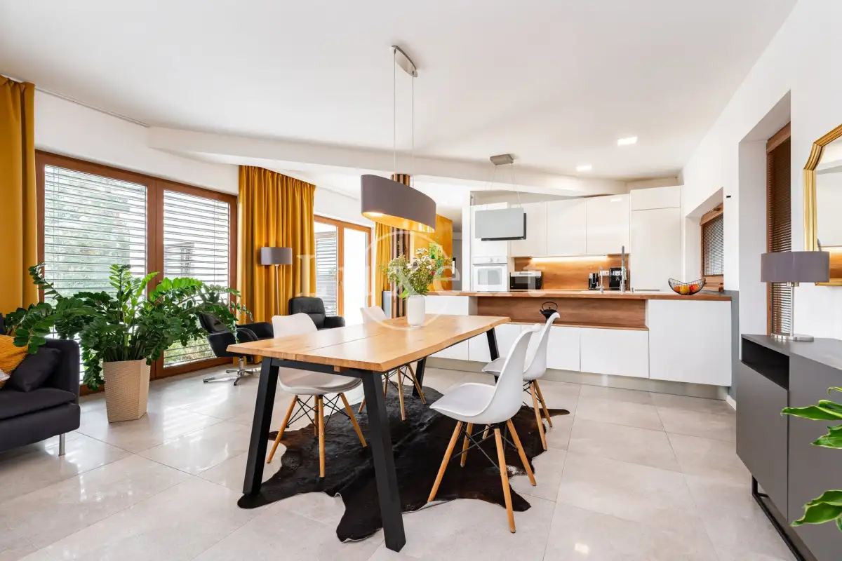 V 1. NP se nachází velmi prostorná předsíň se vstupem do oddělené šatny. 2.NP nabízí pokoj pro hosty s klimatizací (13,7 m2), koupelnou, šatnou (8,7 m2) a úchvatným výhledem na bazén. Dále dětský pokoj o velikosti 9,3 m2 a technickou místnost s toaletou. Součástí 2.NP je velkorysý obývací pokoj s krbem, jídelnou, kuchyní a to vše o velikosti 43,6 m2. Kuchyňská linka HANÁK má veškeré vestavěné spotřebiče, indukční desku, el. troubu s grilem, lednici, myčku a drtič odpadu. Z obývacího pokoje je vstup na severní i jižní terasu. Severní terasa má výsuvnou elektrickou markýzu s čidlem, které automaticky stáhne markýzu při velkém větru, bio krb a posezení v úplném soukromí s výhledem do zahrady. Jižní terasa nabízí naopak slunné posezení a příjemný relax u bazénu o velikosti 6x3 metrů, který má slanou vodou a zastřešení. V 3.NP je hlavní ložnice (15,9 m2) se šatnou (2,3 m2), dětský pokoj (15,6 m2) a koupelna s toaletou. Toto patro má v pokojích klimatizace. Výhledy z tohoto podlaží jsou ohromující.