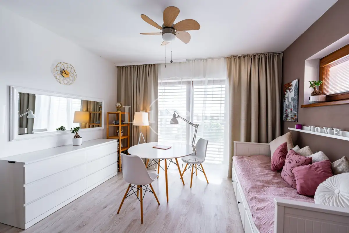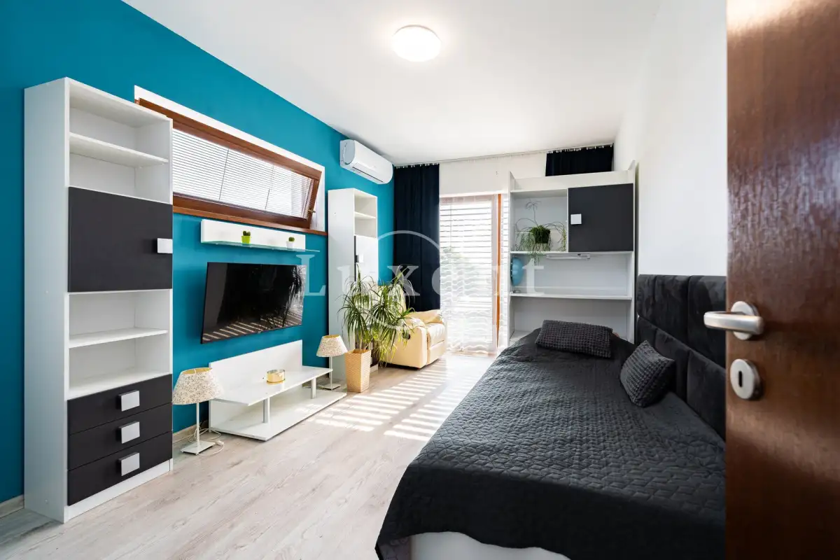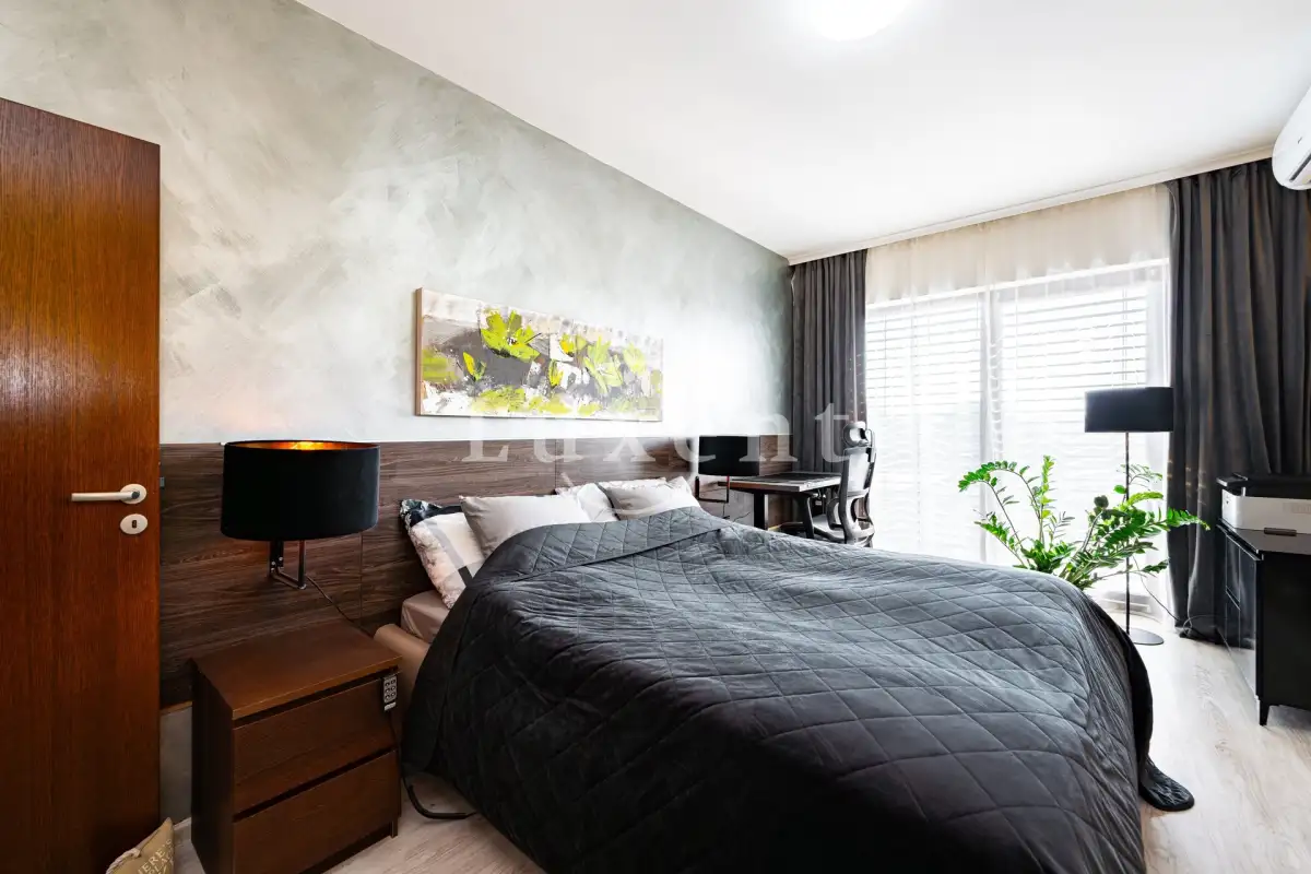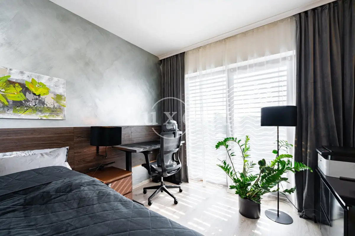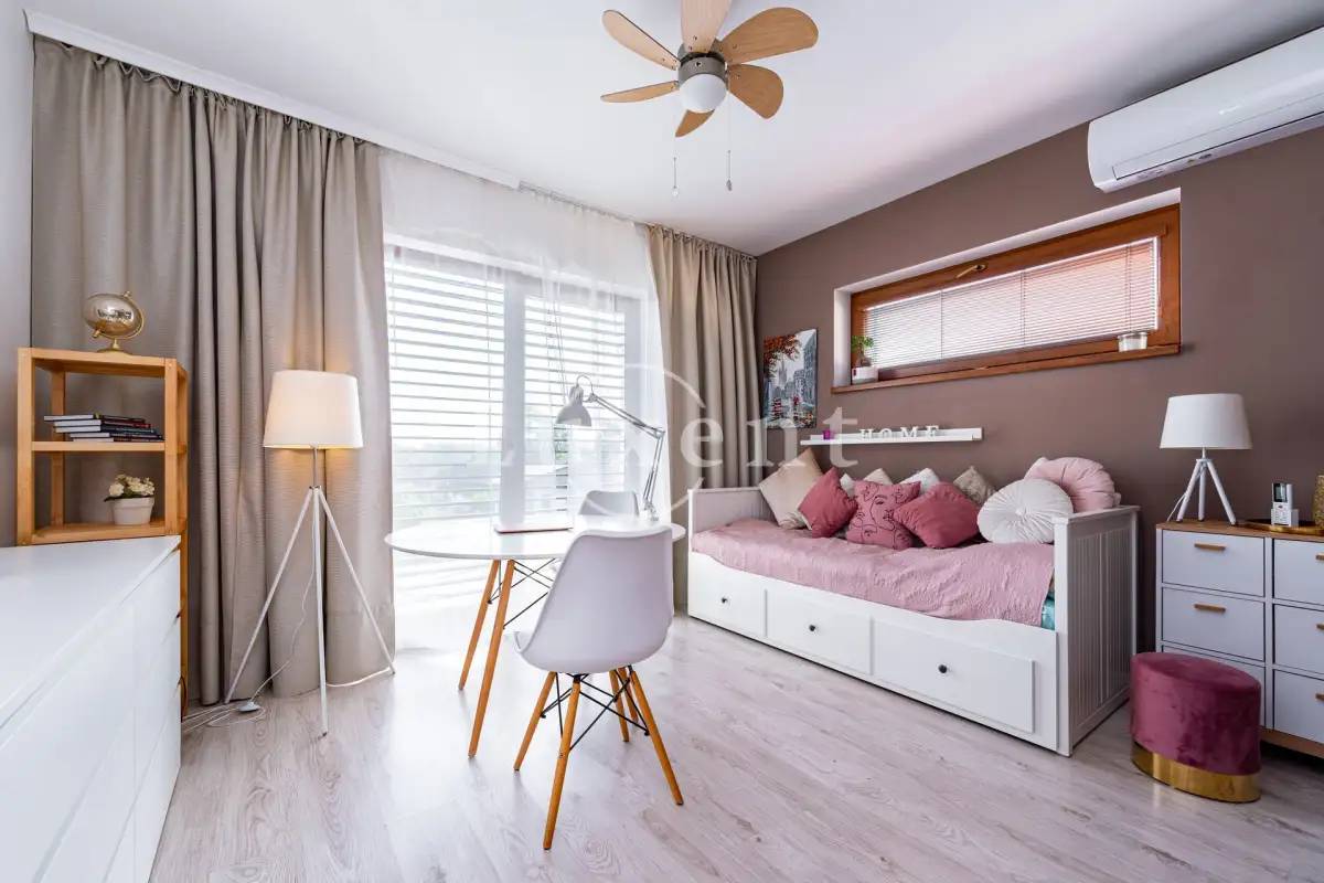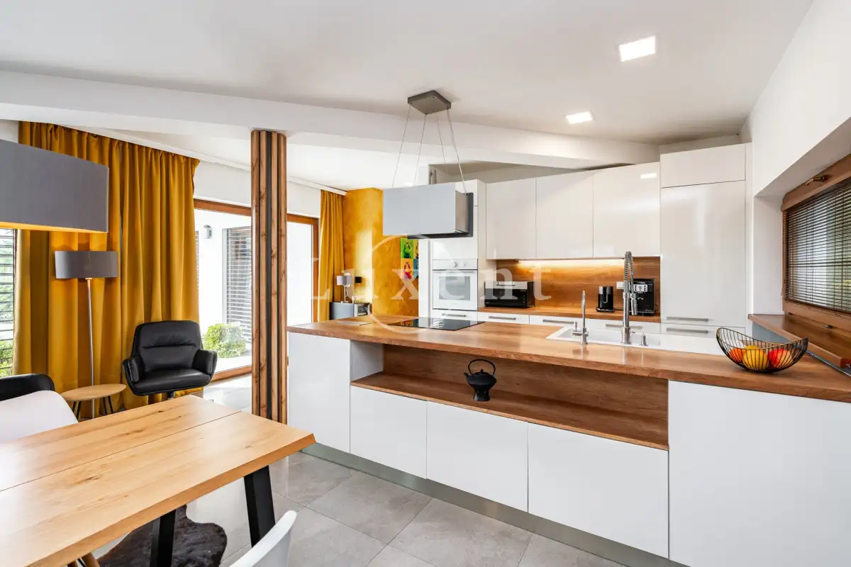 V 1. NP se nachází velmi prostorná předsíň se vstupem do oddělené šatny. 2.NP nabízí pokoj pro hosty s klimatizací (13,7 m2), koupelnou, šatnou (8,7 m2) a úchvatným výhledem na bazén. Dále dětský pokoj o velikosti 9,3 m2 a technickou místnost s toaletou. Součástí 2.NP je velkorysý obývací pokoj s krbem, jídelnou, kuchyní a to vše o velikosti 43,6 m2. Kuchyňská linka HANÁK má veškeré vestavěné spotřebiče, indukční desku, el. troubu s grilem, lednici, myčku a drtič odpadu. Z obývacího pokoje je vstup na severní i jižní terasu. Severní terasa má výsuvnou elektrickou markýzu s čidlem, které automaticky stáhne markýzu při velkém větru, bio krb a posezení v úplném soukromí s výhledem do zahrady. Jižní terasa nabízí naopak slunné posezení a příjemný relax u bazénu o velikosti 6x3 metrů, který má slanou vodou a zastřešení. V 3.NP je hlavní ložnice (15,9 m2) se šatnou (2,3 m2), dětský pokoj (15,6 m2) a koupelna s toaletou. Toto patro má v pokojích klimatizace. Výhledy z tohoto podlaží jsou ohromující.