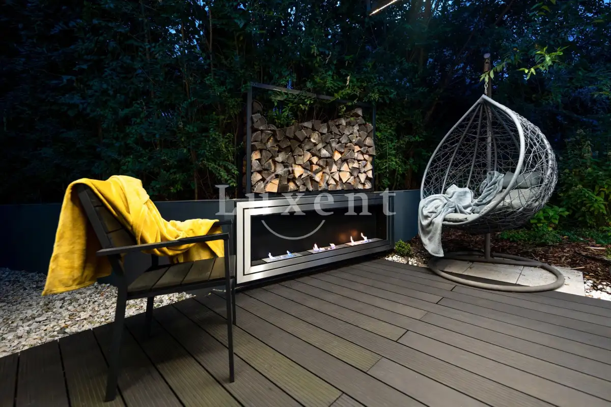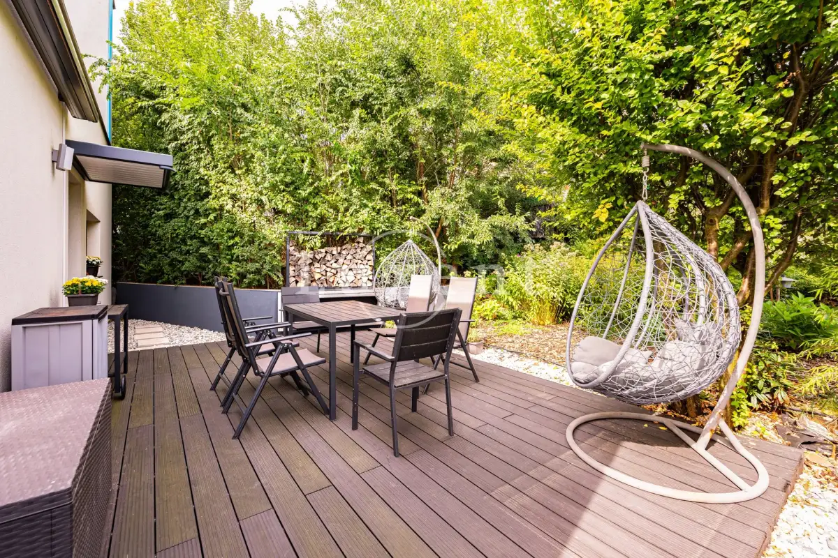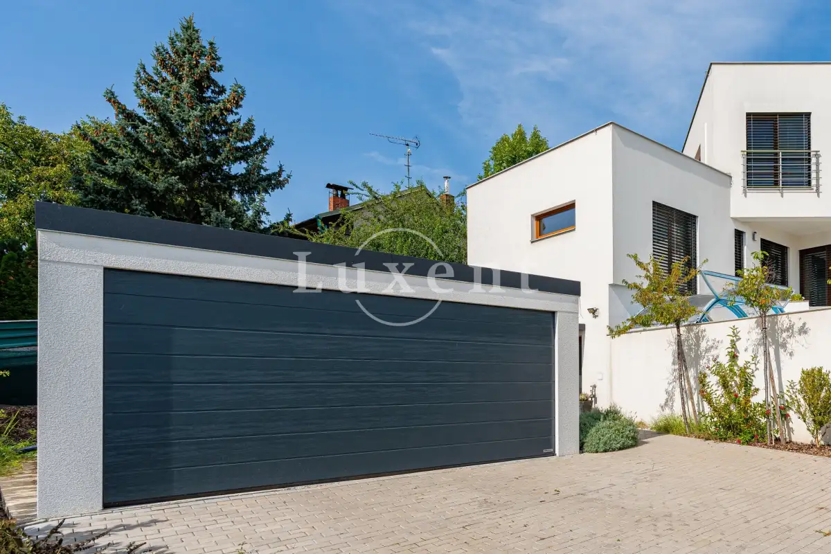 Mezi severní a jižní terasou je zahrada se vzrostlými stromy, s ohništěm a zahradním domkem. Řešením meziúrovňové zahrady, vzniká příjemná rozmanitost k její využití. Zahrada má kompletní závlahový systém, který lze ovládat přes aplikaci a robotickou sekačku. K domu patří garáž pro dva vozy o velikosti 33,8 m2 a součástí je nabíjecí stanice pro elektromobil. Před garáží mohou zaparkovat další dva vozy.