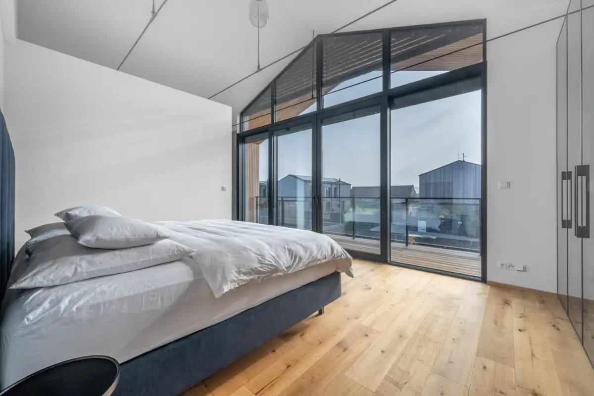 2.NP nabízí velkorysou ložnici (20 m²) s prosklením až do štítu domu a HS portálem, který umožňuje vstup na lodžii ( 11,6 m2) s krásným výhled. Součástí ložnice je koupelna ( 10,6 m²) s vanou, sprchovým koutem, dvěma umyvadly a samostatnou toaletou. Na patře jsou další tři ložnice, ke kterým naleží další koupelna s vanou, sprchovým koutem, dvěma umyvadly a toaletou.