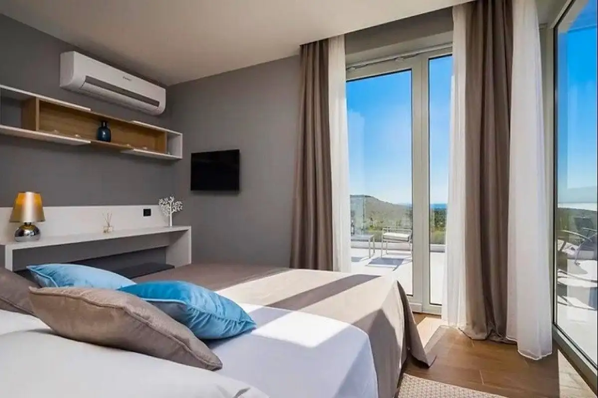V prvním patře jsou tři elegantní ložnice, každá s vlastní koupelnou a přístupem na jižně orientované terasy, které poskytují dechberoucí panoramatický výhled na moře a okolní přírodu.