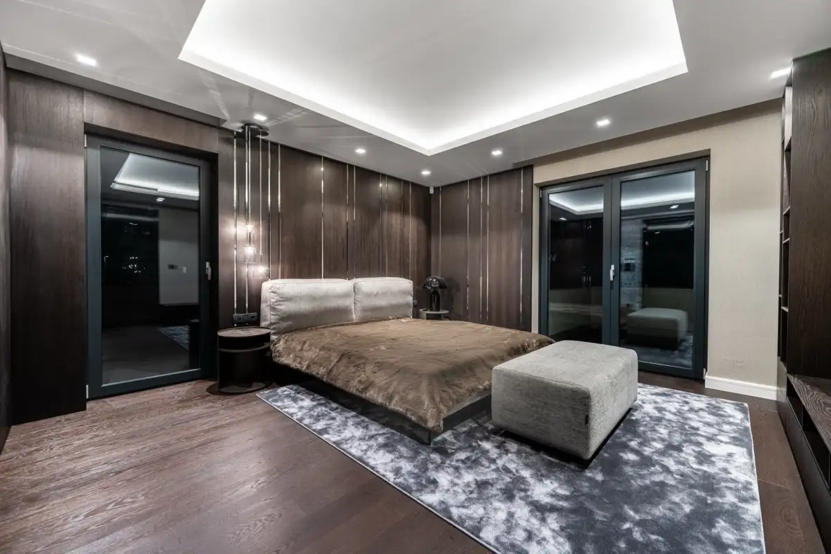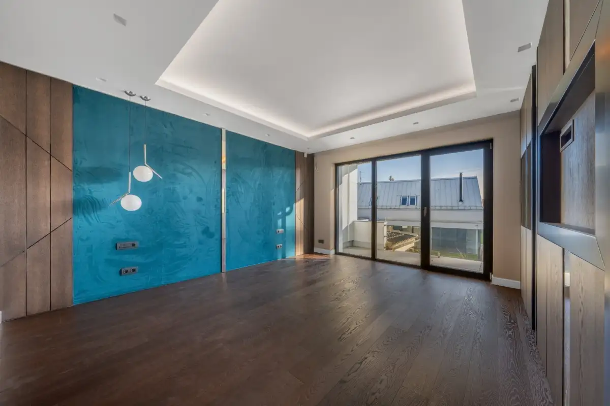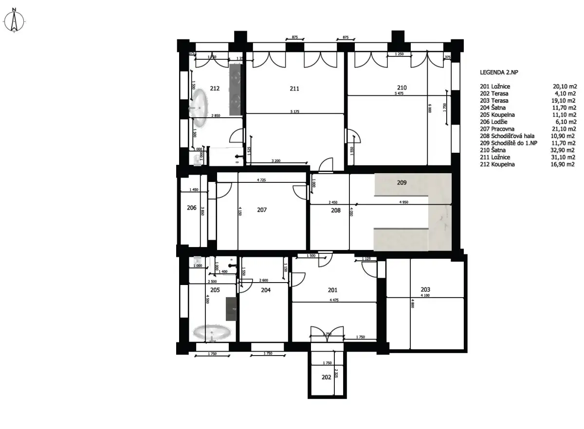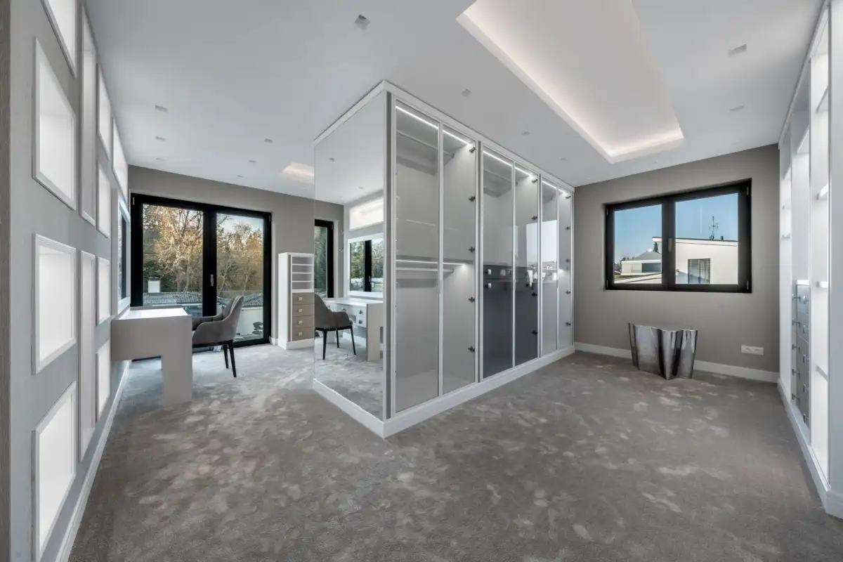 V prvním patře se nacházejí dvě hlavní ložnice, každá s vlastní šatnou, dále dvě luxusní koupelny vybavené sanitou Gessi, volně stojící vanou či walk-in sprchou. Součástí je také pracovna (možné užívat jako další ložnici) a dvě terasy, které poskytují prostor pro odpočinek i práci v soukromí. Pro potřeby další ložnice je možné provést dispoziční úpravu. Dům je vybaven smart home systémem, klimatizací, podlahovým vytápěním a elektronicky ovládanými venkovními žaluziemi i interiérovými závěsy. Pro maximální pohodlí je připravena studie na instalaci výtahu. Bezpečnost zajišťuje rozsáhlý kamerový systém i zabezpečovací zařízení. Součástí nemovitosti je rovněž garáž pro dva vozy, další čtyři auta je možné parkovat před domem na zpevněné ploše či realizovat konstrukční zastřešení.