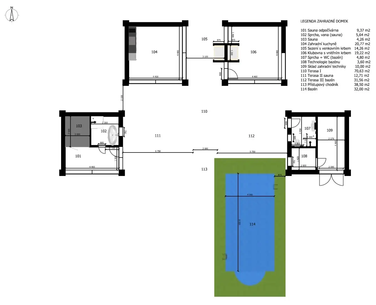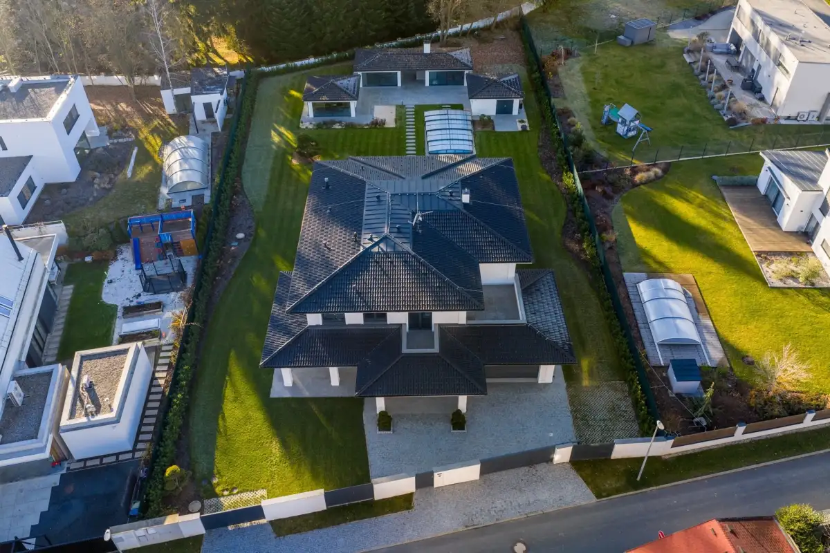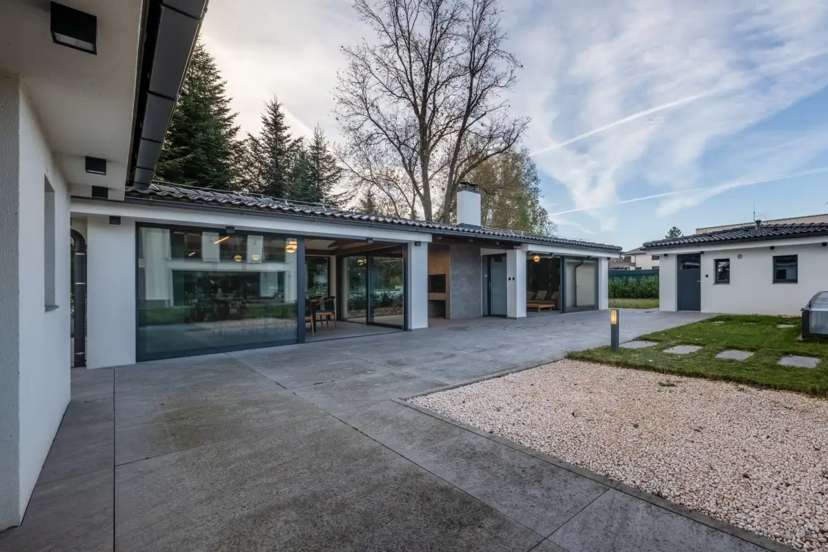 Součástí pozemku je privátní wellness zóna s vyhřívaným bazénem (8x4m), finskou saunou, letní kuchyní a stylovou odpočinkovou místností s mechovou stěnou a krbem, která nabízí perfektní zázemí pro relaxaci i společenské setkávání.