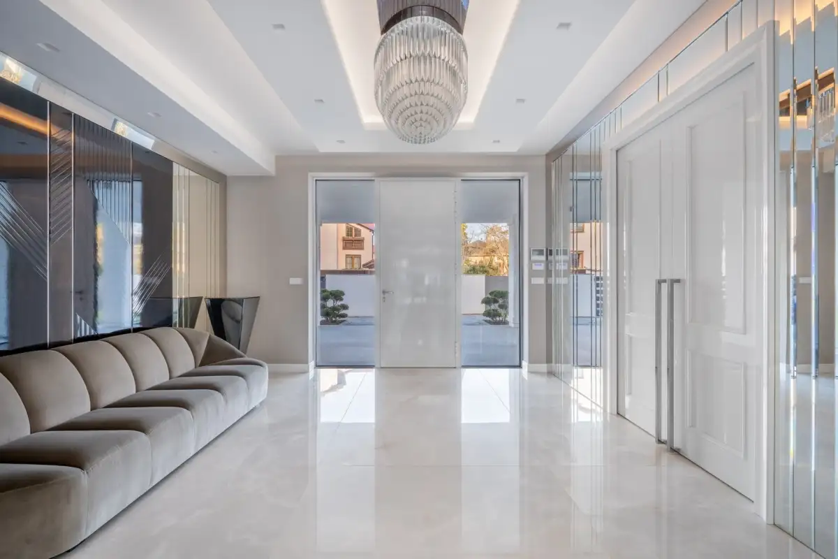 Vstupní část tvoří předsíň a prostorná hala s úložnými prostory a skleněnými posuvnými dveřmi, která plynule přechází do otevřeného společenského prostoru. Dominantou je prémiová kuchyně SieMatic se spotřebiči Miele, navazující jídelna s masivním stolem Wedge a velkorysý obývací pokoj s moderním krbem. Celý prostor prosvětlují velkoformátová francouzská okna, jež zároveň propojují interiér se zahradou a dodávají místnostem výjimečnou vzdušnost. Atmosféru podtrhují ručně vyráběné křišťálové lustry na míru. V prvním podlaží se dále nachází technická místnost, prádelna, spíž a samostatná toaleta.