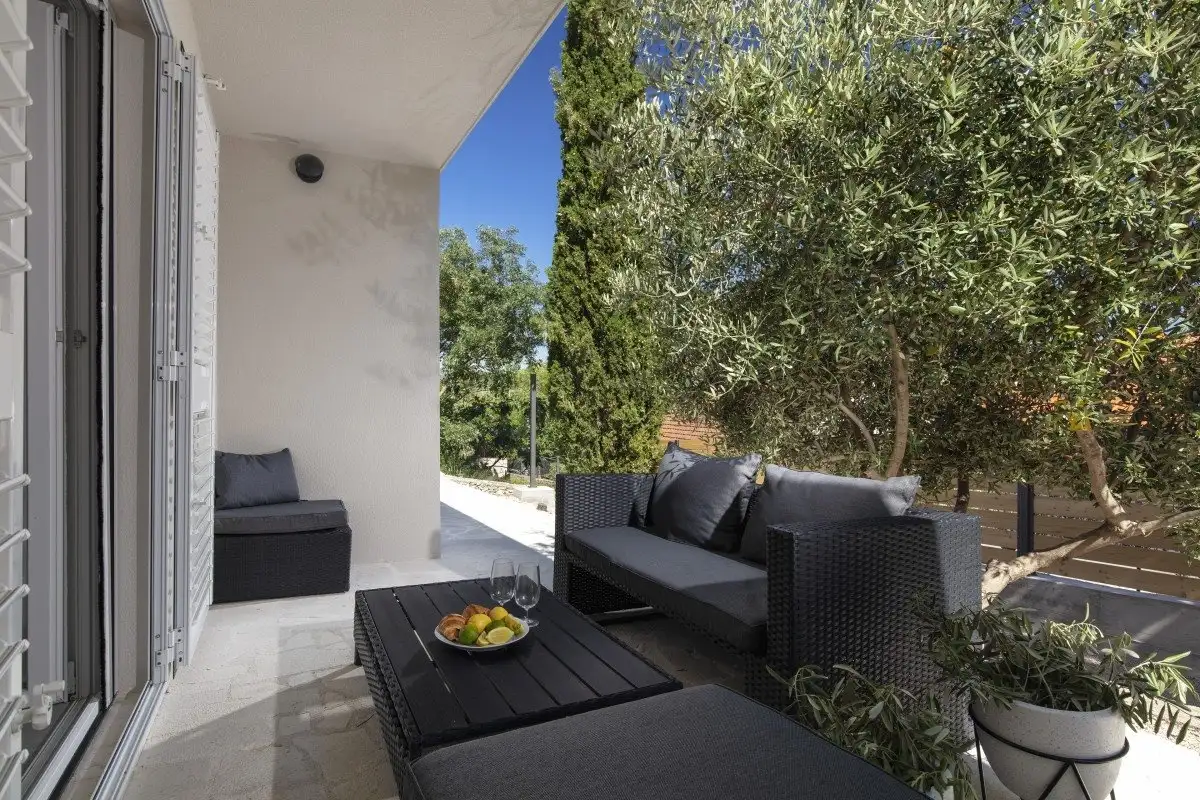 Nabízíme na prodej moderní rodinný dům v malebném městečku Rogoznica v srdci chorvatské Dalmácie, situovaný v mimořádně atraktivní lokalitě pouhých 150 metrů od moře a centra města. Nemovitost se nachází na pozemku o rozloze 530 m², který zahrnuje obytnou budovu a parkovací plochu. Dům se rozkládá na třech podlažích a nabízí tři samostatné, plně vybavené apartmány. V přízemí se nachází jednopokojový apartmán se soukromou zahradou a krytou terasou, v prvním patře dvoupokojový apartmán s prostornou terasou a výhledem na moře a v nejvyšším patře luxusní penthouse se dvěma ložnicemi, dvěma koupelnami, velkou terasou s panoramatickým výhledem na moře a vlastní posilovnou.
