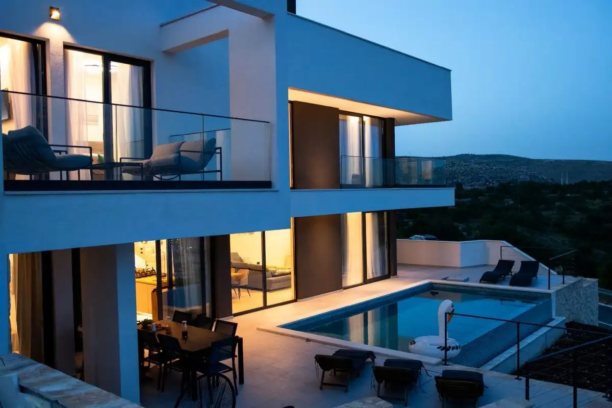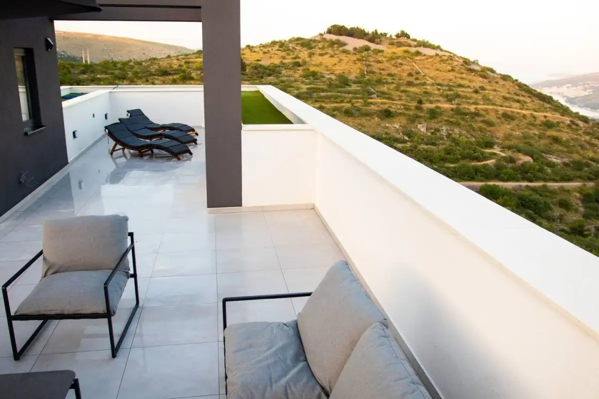 Silnou stránkou této vily je nejen moderní design, ale i výhledy, které jsou dostupné téměř z každého koutu domu. Lokalita nabízí klid a soukromí daleko od ruchu města a přesto je velmi dobře dostupná – v blízkosti jsou město Trogir, letiště, dálniční spojení a veškerá občanská vybavenost.
