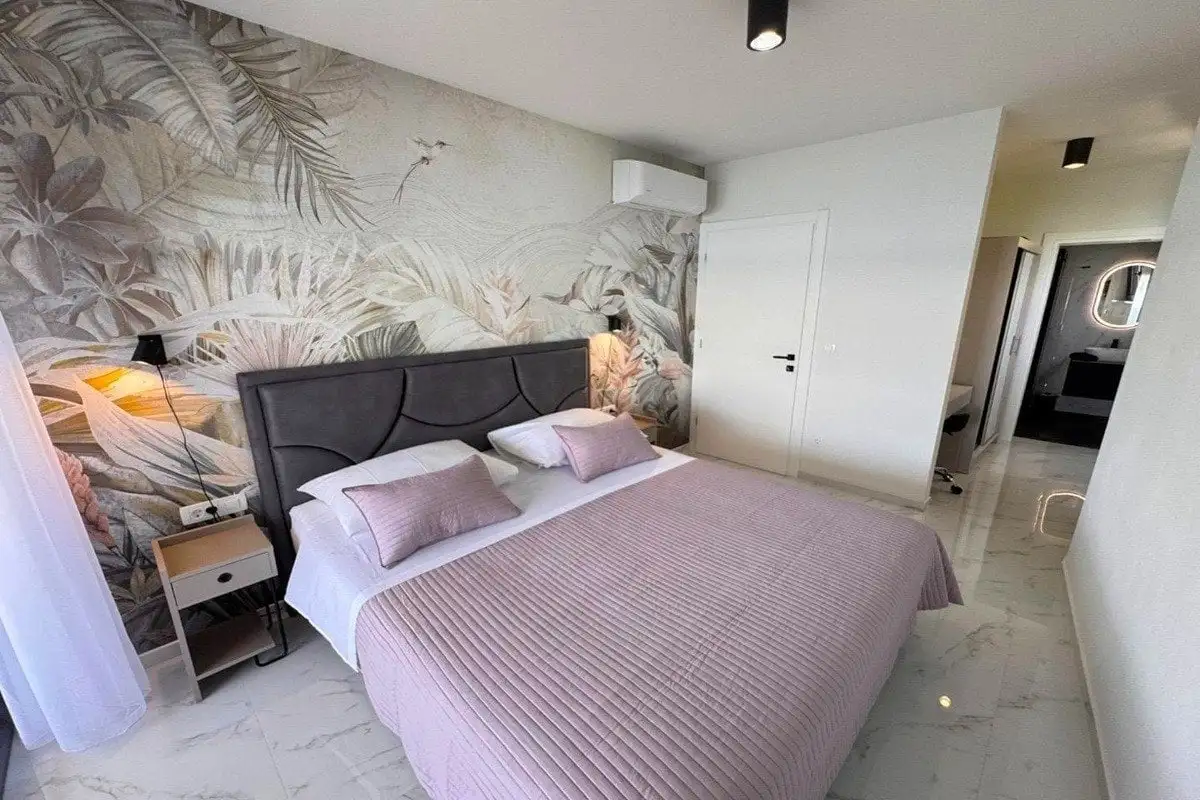 Interiér vily je rozdělen do tří podlaží. V přízemí se nachází otevřený obytný prostor s kuchyní, jídelnou a obývacím pokojem se vstupem na terasu, toaleta pro hosty a multifunkční místnost se samostatným vchodem, kterou lze využít jako fitness, saunu či pracovnu. V prvním patře jsou umístěny dvě prostorné ložnice, každá s vlastní koupelnou a společnou terasou. Druhé patro tvoří luxusní hlavní ložnice s en-suite koupelnou a velkou terasou, ideální pro ničím nerušený odpočinek.