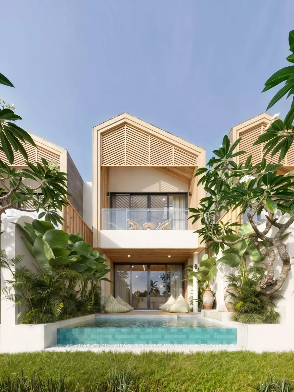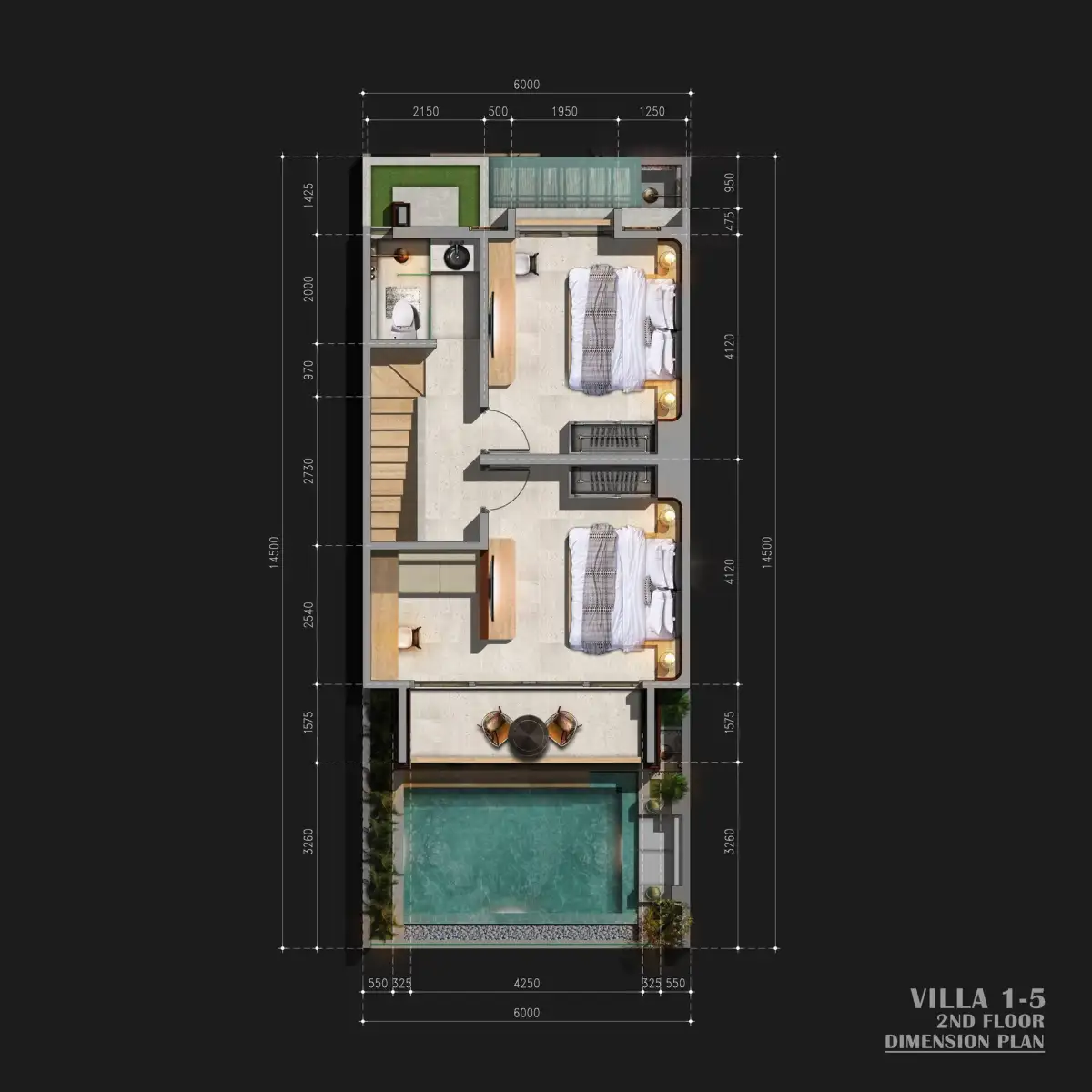 Vily jsou navrženy v elegantním moderním stylu s důrazem na funkční dispozice a maximální komfort každodenního užívání. Každá dvoupodlažní vila o celkové ploše cca 149 m² nabízí dvě ložnice, dvě koupelny, soukromý přelivný bazén, terasu z teakového dřeva a balkon s výhledem do zeleně. Součástí dispozice je také pracovna a otevřený obývací prostor propojený s plně vybavenou kuchyní.