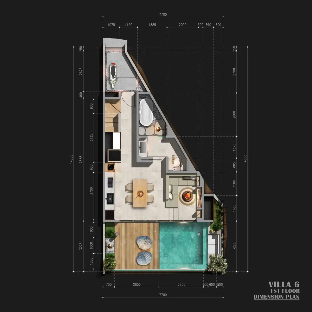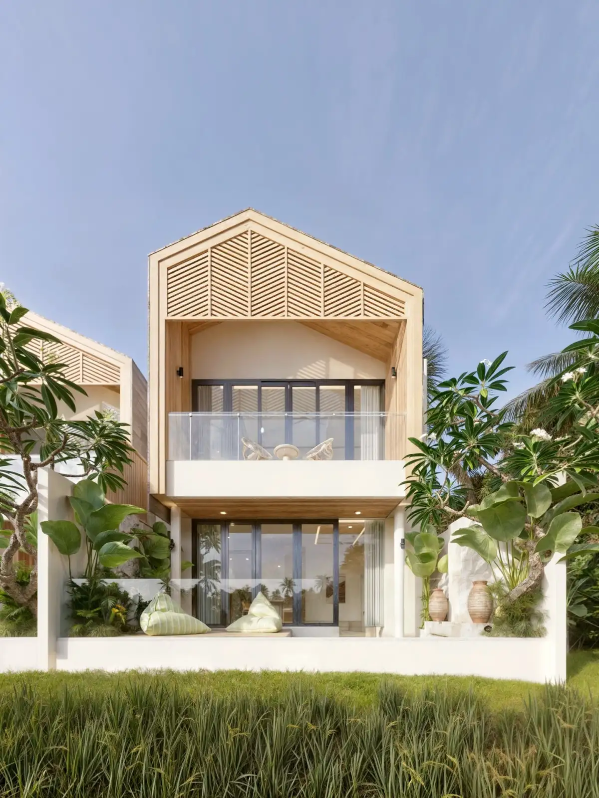 Vily jsou navrženy v elegantním moderním stylu s důrazem na funkční dispozice a maximální komfort každodenního užívání. Dvoupodlažní vila nabízí jednu hlavní ložnici, druhý menší pokoj vhodný jako pracovna, dvě koupelny, soukromý přelivný bazén, terasu z teakového dřeva a balkon s výhledem do zeleně. Dispozice dále zahrnuje otevřený obývací prostor propojený s plně vybavenou kuchyní.