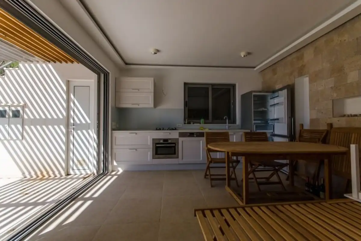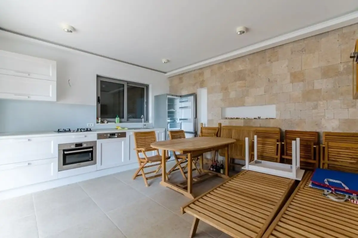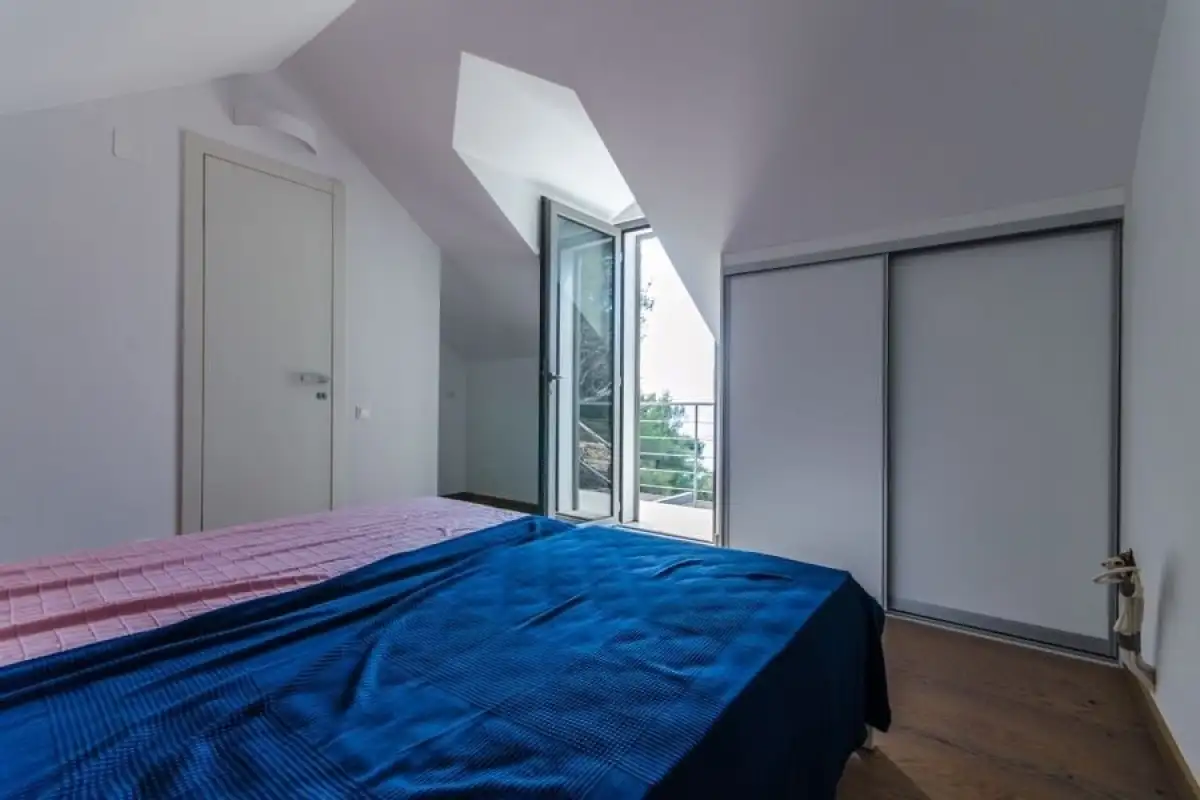 Venkovní schodiště, pod kterým se nachází praktická spíž, vede do prvního patra (vysokého podkroví), kde se nacházejí dvě další ložnice, koupelna a balkon s nerušeným výhledem na moře.