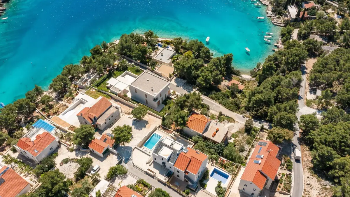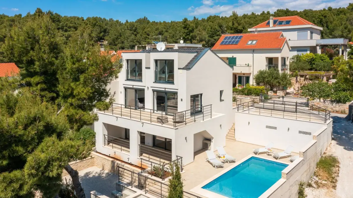 Nabízíme k prodeji krásnou moderní vilu situovanou v klidné zátoce na ostrově Brač, jen 5 minut jízdy od malebného přístavu Milna. Tato elegantní nemovitost se nachází ve druhé řadě od moře a pouhých pár minut chůze od pláže, díky čemuž nabízí ideální kombinaci soukromí, výhledu na moře a snadného přístupu k pobřeží.
