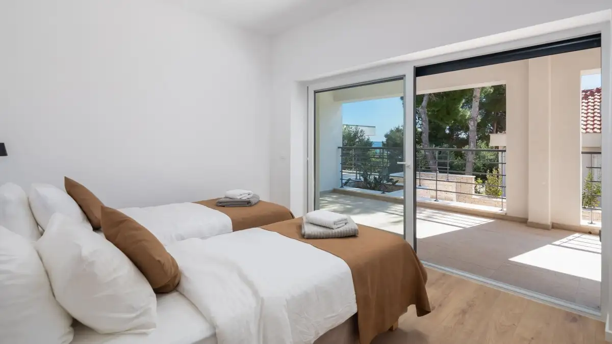V prvním patře se nachází další dvě ložnice, každá opět s vlastní koupelnou, a hlavní terasa s nádherným výhledem na moře. K vile náleží také bazén, umístěný stranou pro maximální soukromí, a venkovní parkoviště pro několik vozidel. Celý pozemek je oplocen, což zajišťuje klid a soukromí i během letních měsíců.