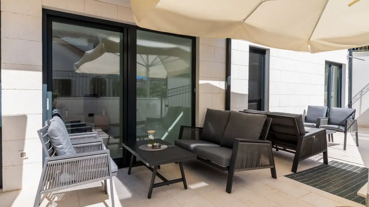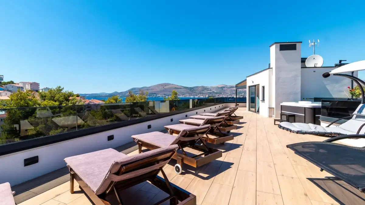 Celé druhé patro patří exkluzivnímu penthouse apartmánu, který nabízí čtyři ložnice, tři terasy, venkovní kuchyni a přímý vstup na zelenou střešní terasu. Ta je vybavena vířivkou, sluneční zónou a relaxačním koutem s nádherným výhledem na moře, což z penthousu činí skutečně výjimečné místo pro bydlení nebo prémiový pronájem.