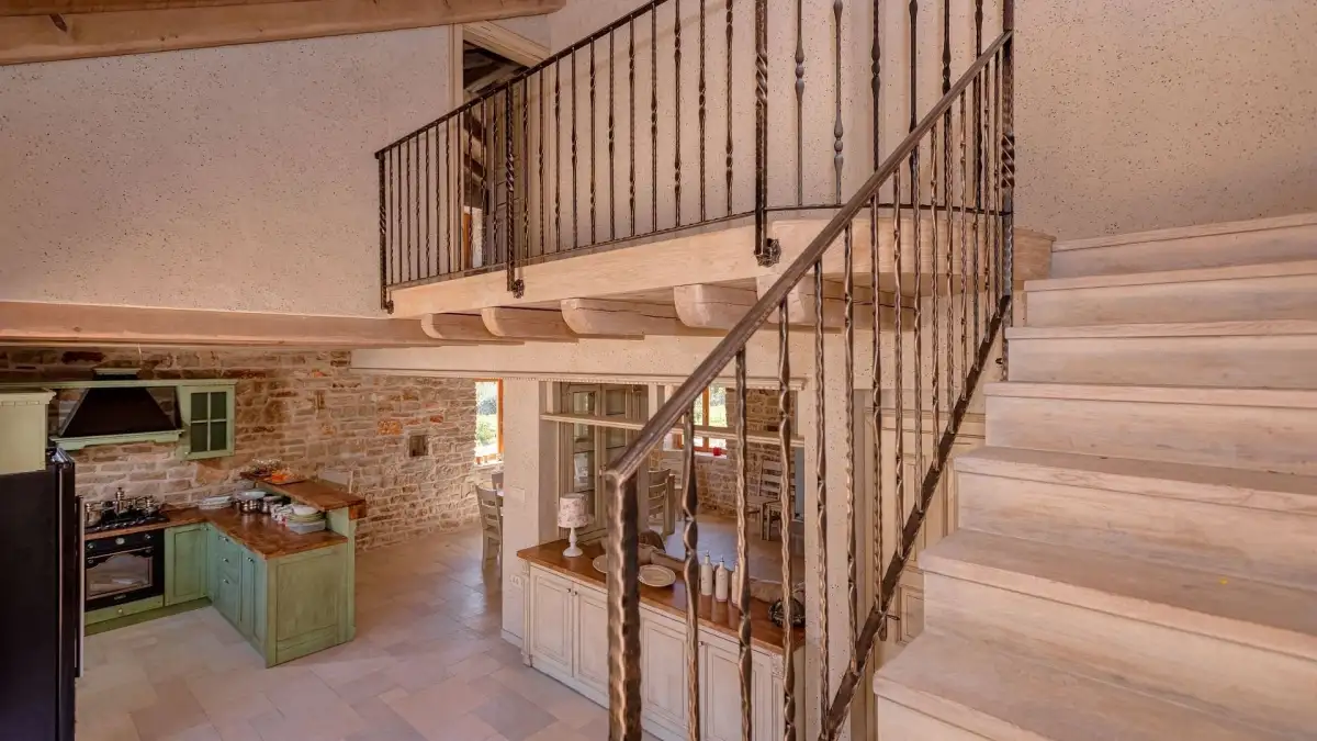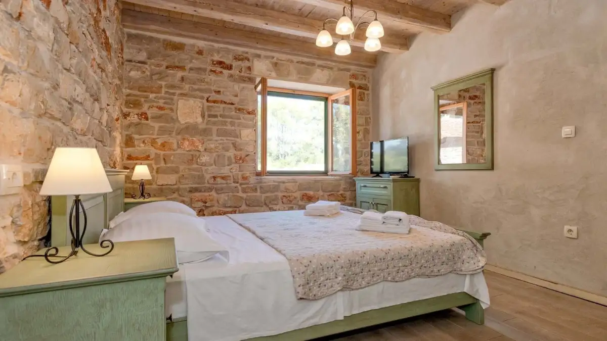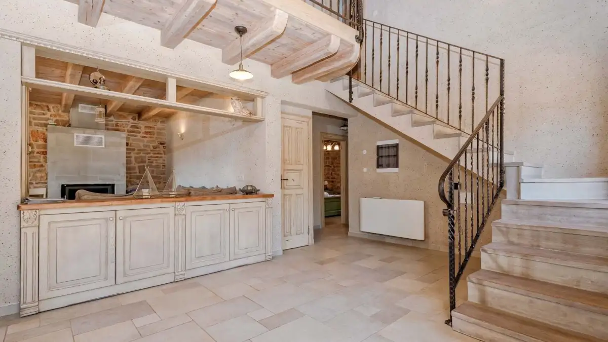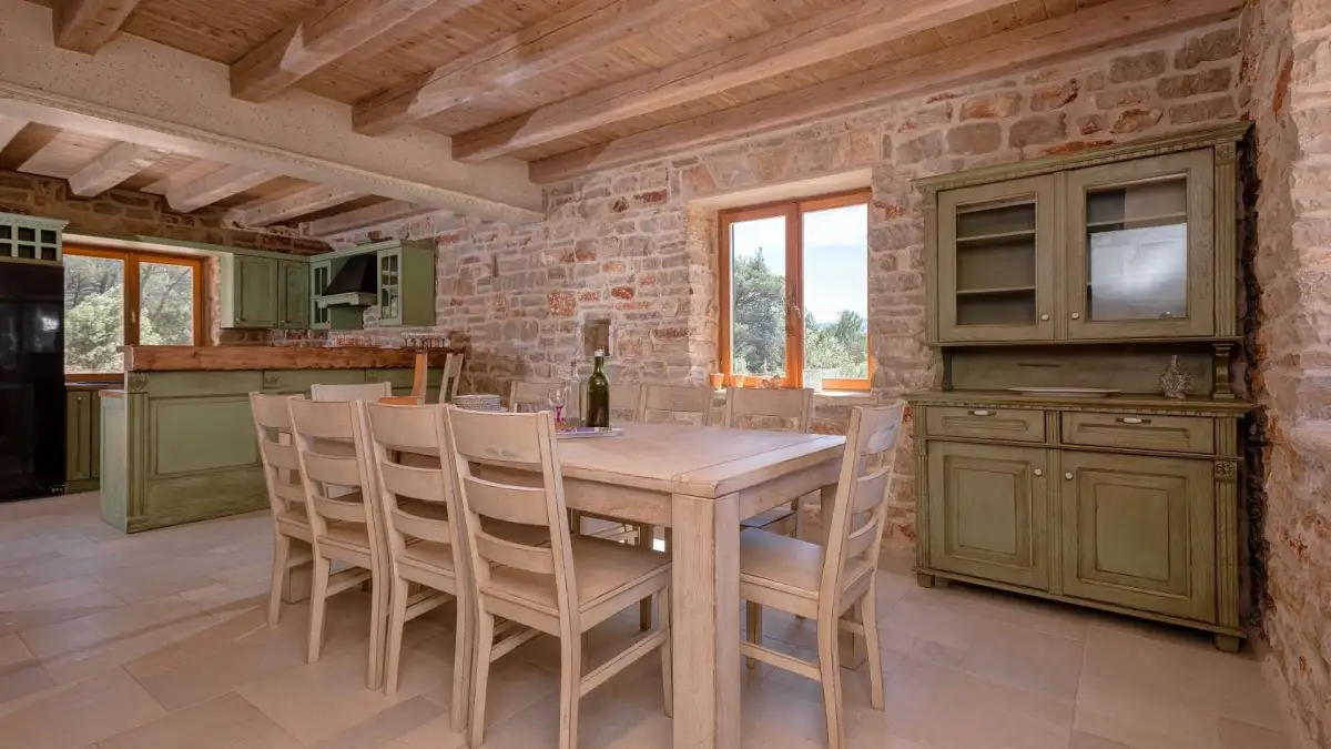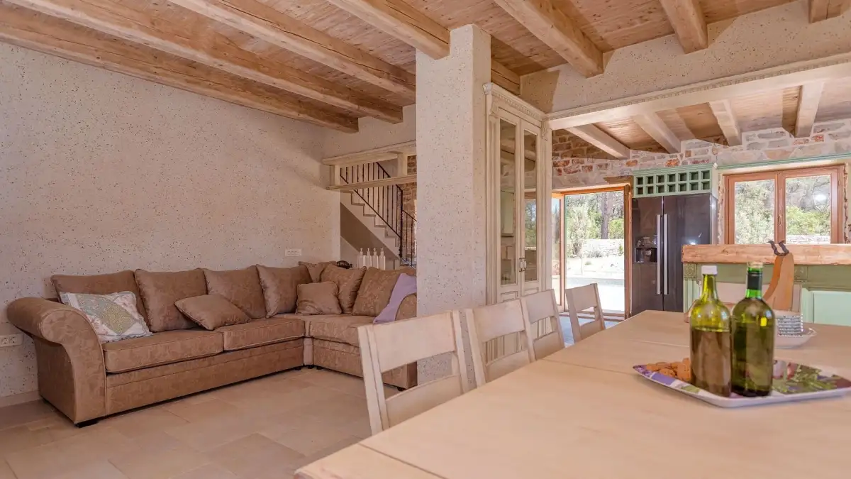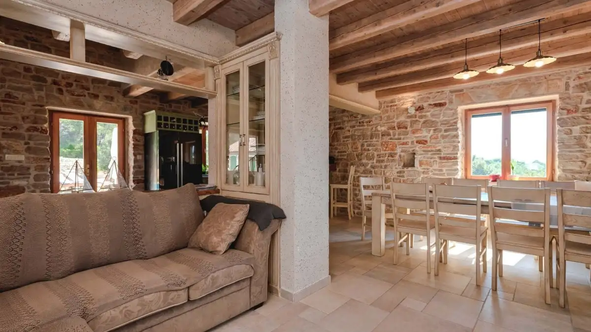 Hlavní dům o zastavěné ploše 120 m² je rozdělen do tří podlaží. V suterénu se nachází technická místnost a prostor ideální pro vinotéku či tradiční dalmatskou konobu. V přízemí se rozprostírá stylová kuchyně s barem, jídelna, obývací pokoj s krbem, toaleta a dvě ložnice s vlastními koupelnami. V podkroví se pak nachází další dvě ložnice, rovněž s en-suite koupelnami.
