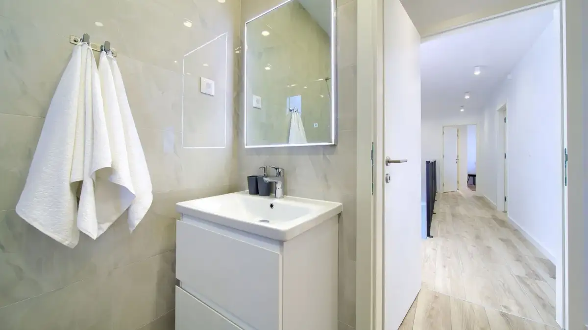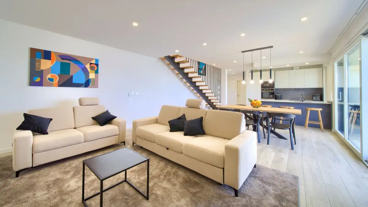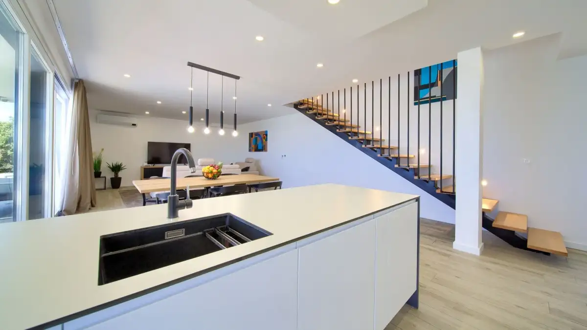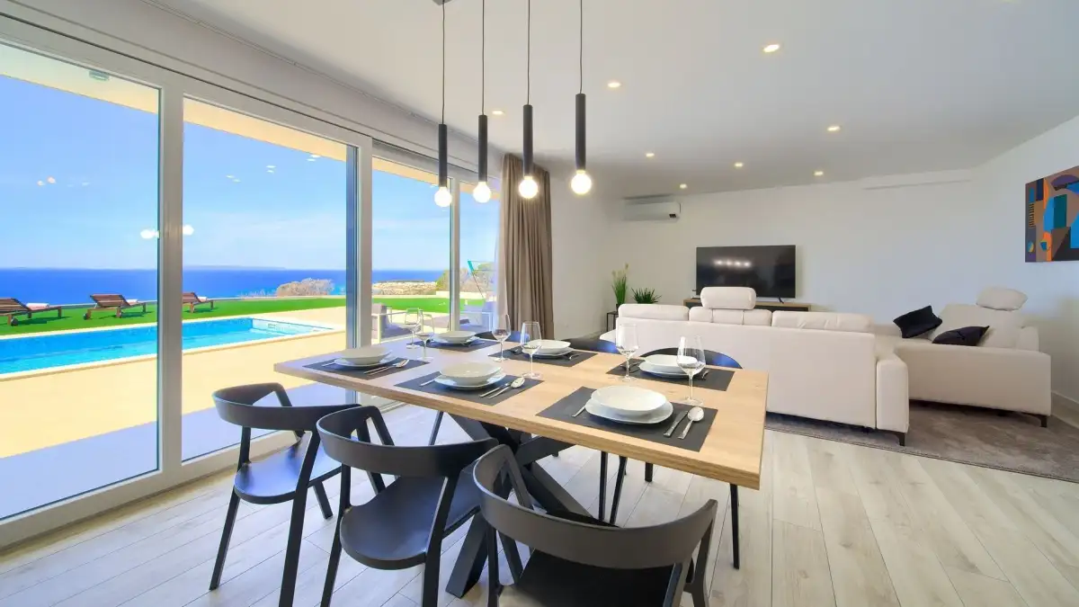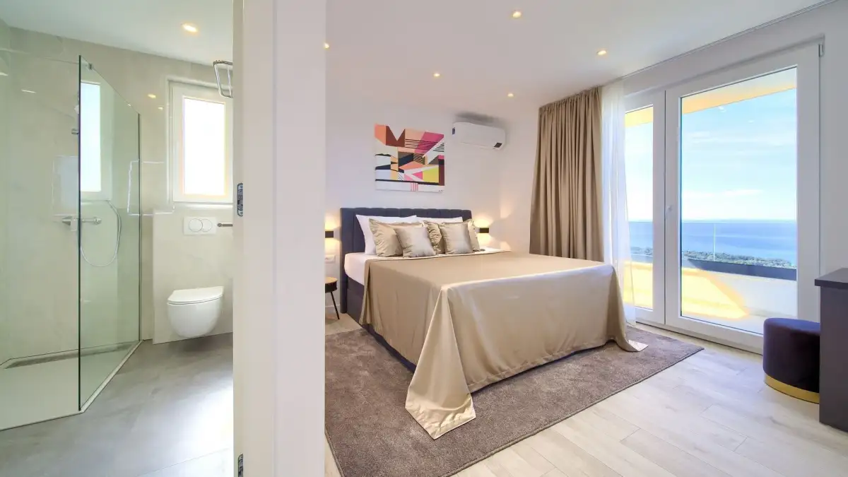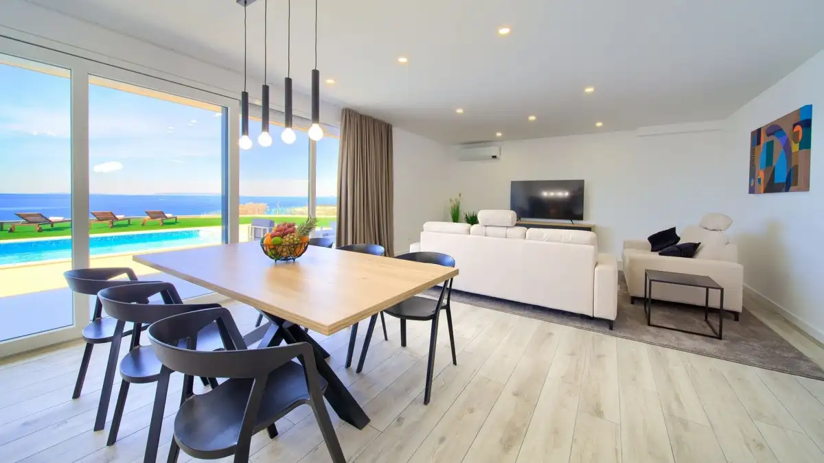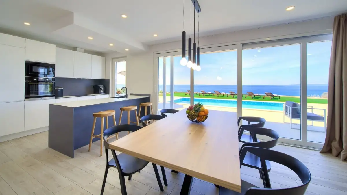 Vila je dispozičně řešena na dvě podlaží. Přízemí tvoří vstupní hala a otevřený obytný prostor propojující obývací pokoj, jídelnu a kuchyni. Dále se zde nachází samostatná toaleta a plně vybavená prádelna. Vnitřní schodiště vede do prvního patra, které je koncipováno jako relaxační zóna se třemi komfortními ložnicemi, z nichž každá má vlastní koupelnu a přístup na prostornou společnou terasu s výhledem na moře.