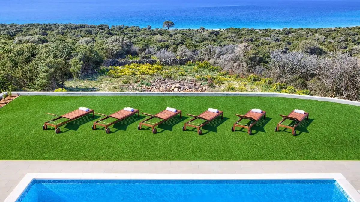 Na oploceném pozemku se nachází bazén s plochou na opalování, zastřešené posezení s venkovním grilem a dostatečný počet parkovacích míst. Součástí prodeje je rovněž sousední pozemek, přístupný samostatnou boční cestou, kde se nachází mladé olivovníky a fíkovníky. Celý areál poskytuje naprosté soukromí a klid, ideální pro relaxaci a pobyt mimo městský ruch.