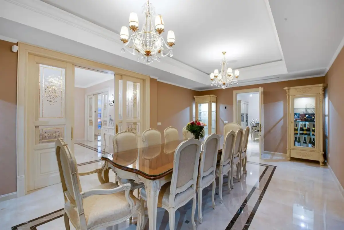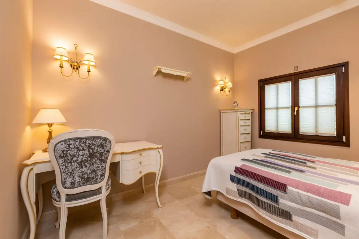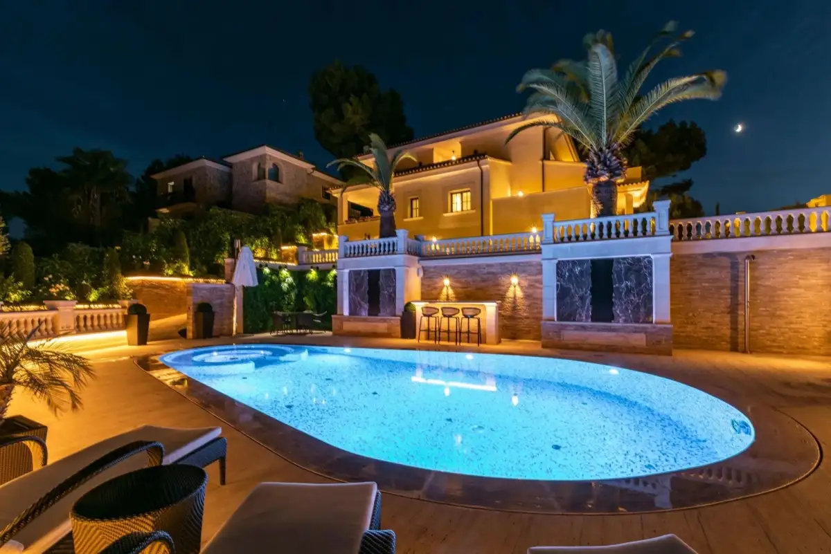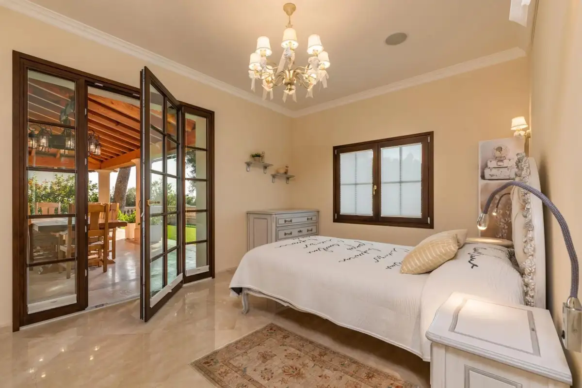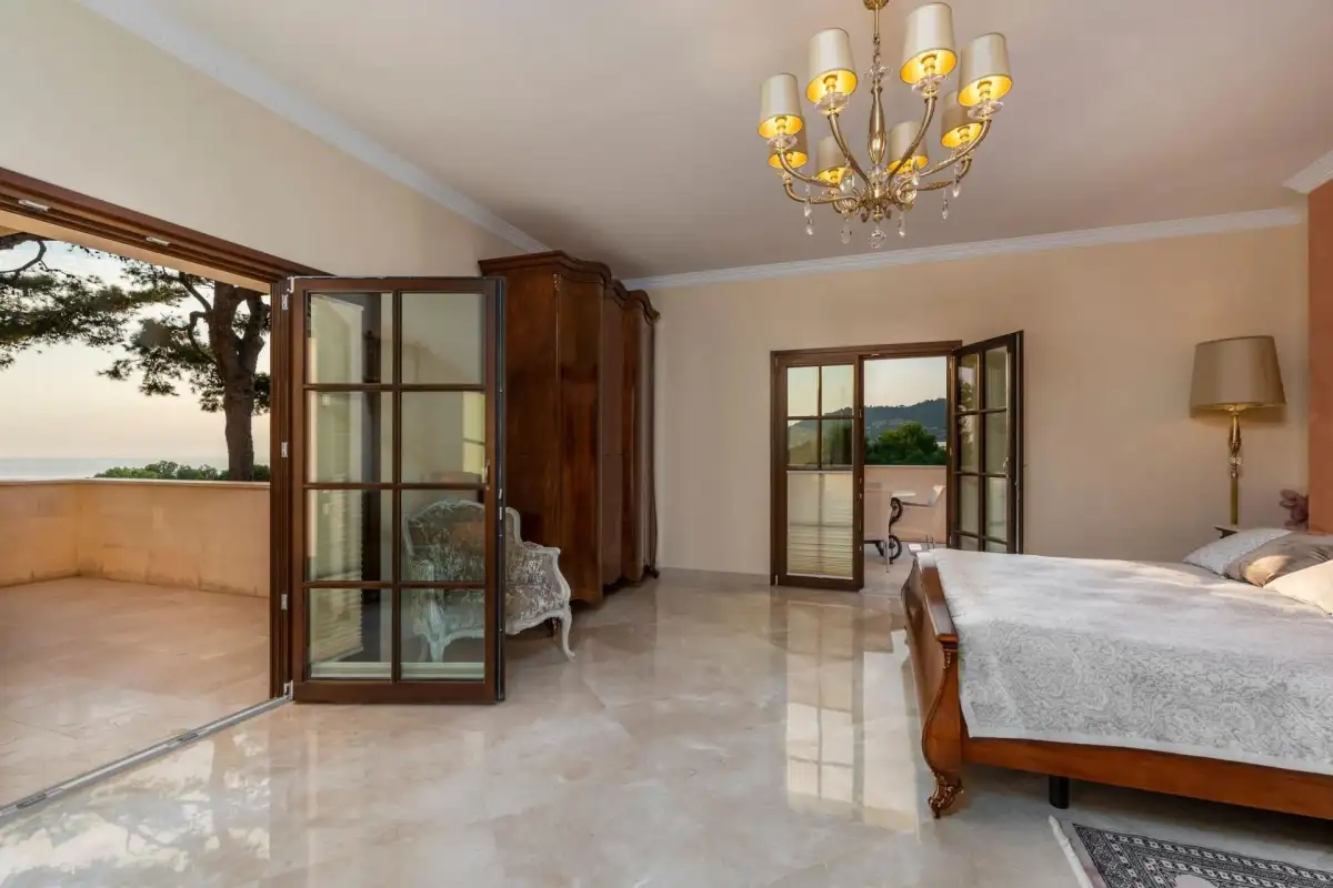 Nabízená nemovitost disponuje šesti ložnicemi a sedmi koupelnami, vířivkou a masivním vyhřívaným bazénem (98 m³) se slanou vodou. Bazén má čistící systém a protiproudovou trysku. V suterénu naleznete prostornou garáž pro tři auta a saunu, v přízemí se nachází prostorný obývací prostor, samostatná jídelna, další obývací pokoj s krbem, prádelna, kuchyně, snídaňová terasa, velká krytá terasa, dvě ložnice s koupelnami a toaleta pro hosty. V prvním patře se nachází další ložnice s koupelnami, herna a terasy s úchvatným výhledem na moře a pohoří Sierra de Tramuntana. Vila je vybavená alarmem, kamerovým systémem a speciálním světelným systémem. Je zde zaveden optický internet. K vile naleží garáž a další parkovací stání před vilou.