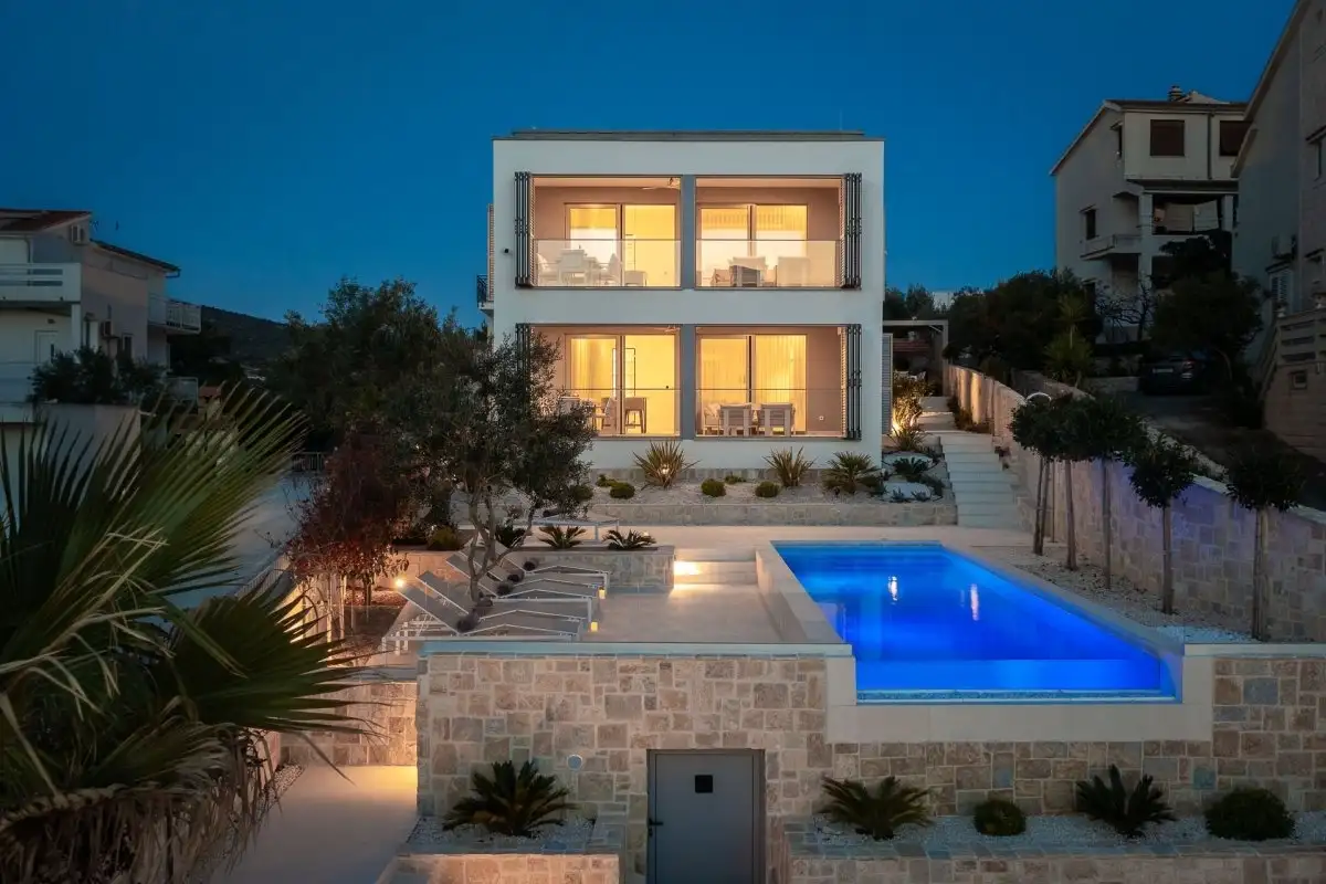 Nabízíme k prodeji nádhernou novostavbu vily s bazénem, situovanou v malém turistickém letovisku poblíž Rogoznice v první řadě u moře. Vila leží jen pár kroků od malebné přírodní oblázkové pláže a působivých kamenných útesů. Díky své jihozápadní orientaci si užijete celodenní slunce a dechberoucí západy.