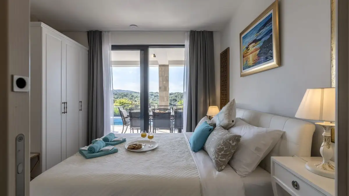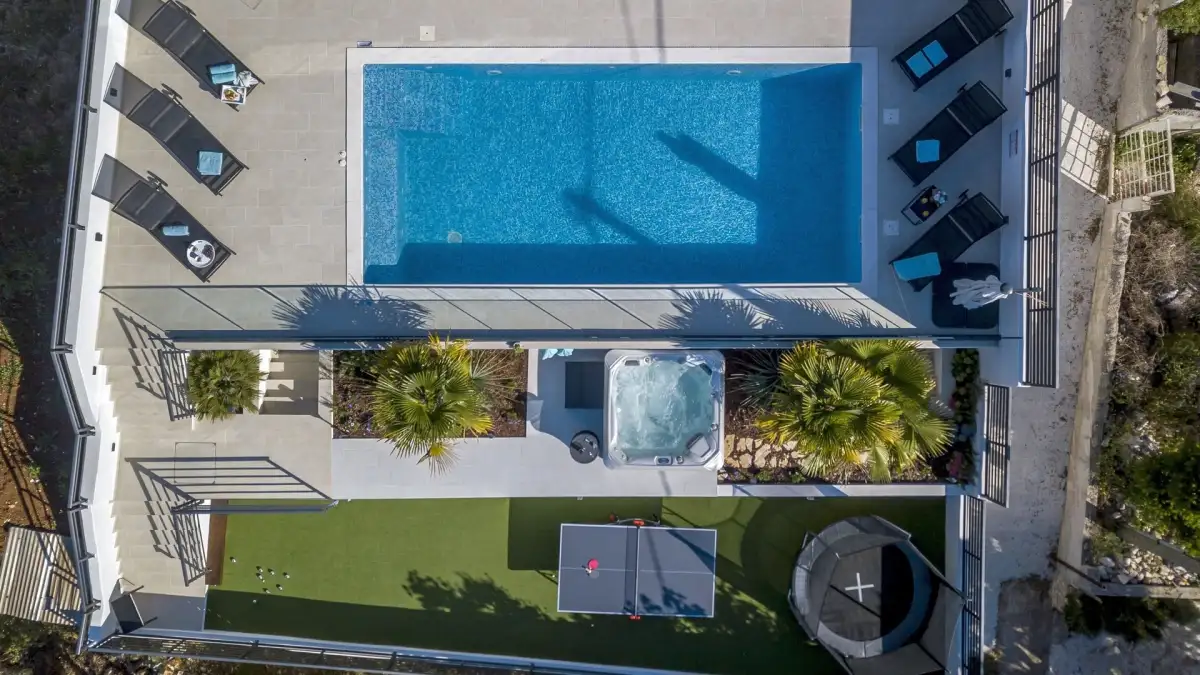 Venkovní prostor je promyšleně upravený pro relaxaci i zábavu – vyhřívaný bazén s výhledem na moře, vířivka, krytá venkovní kuchyně s jídelním koutem, gril, prostor pro opalování, stolní tenis i dětské hřiště. Vila se prodává kompletně zařízená a připravená k okamžitému užívání. Je ideální volbou pro ty, kteří hledají moderní prázdninový dům, soukromé útočiště, nebo stabilní investici do turistického pronájmu.