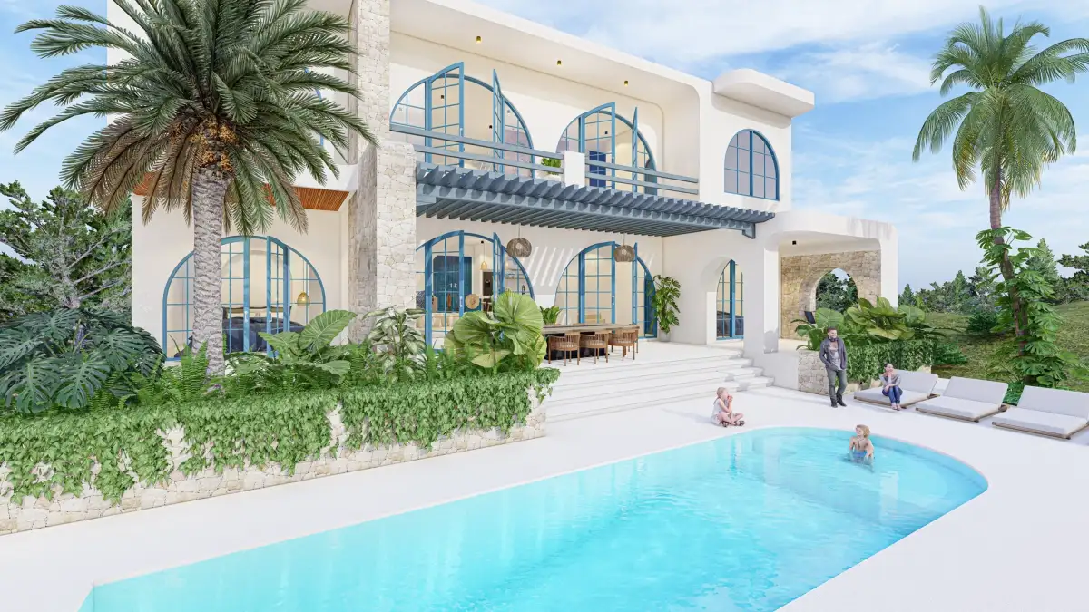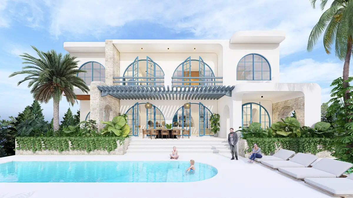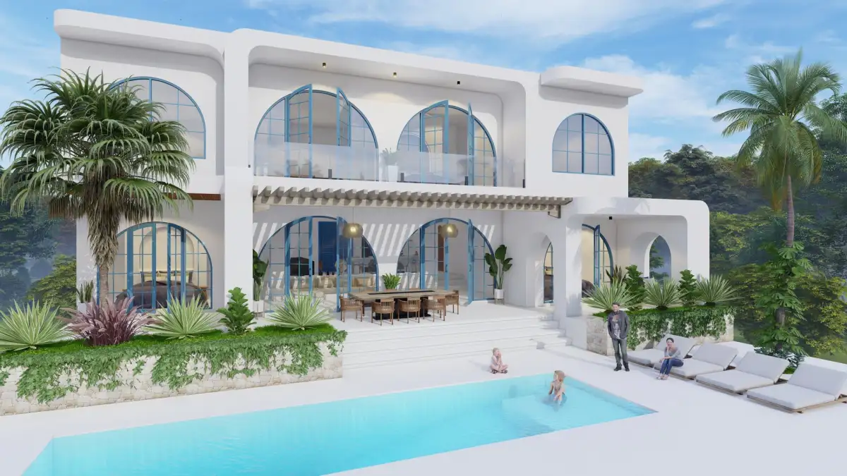 Vila o celkové podlahové ploše 323 m² na pozemku 800 m² disponuje prostorným obývacím pokojem s kuchyňským koutem, třemi ložnicemi, lodžií a prostornou terasou s velkým soukromým bazénem.