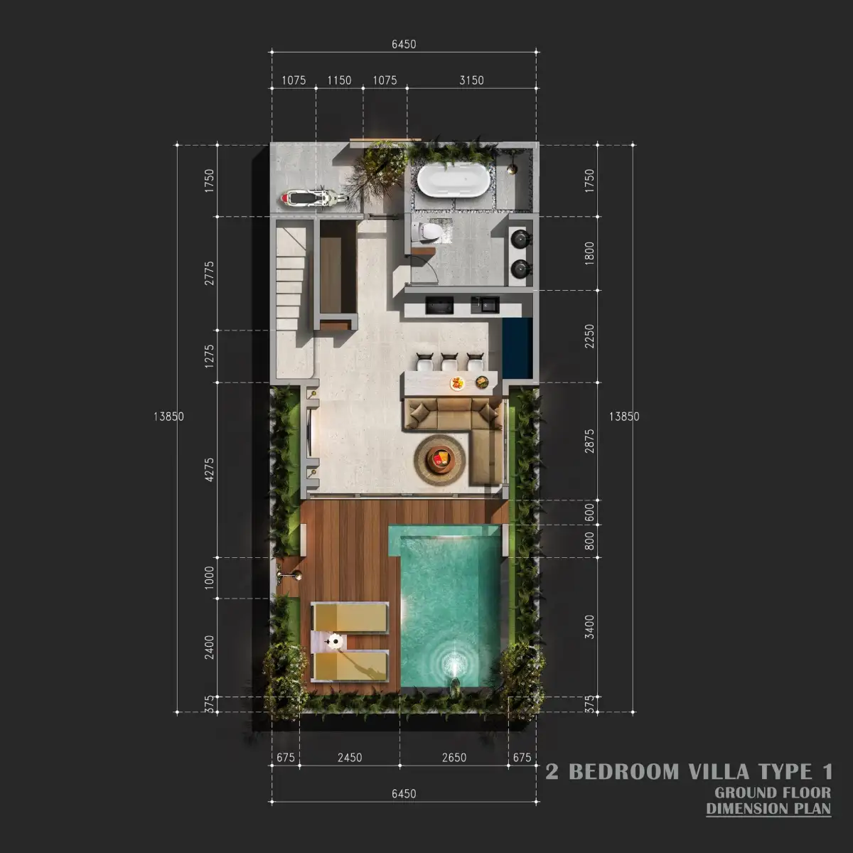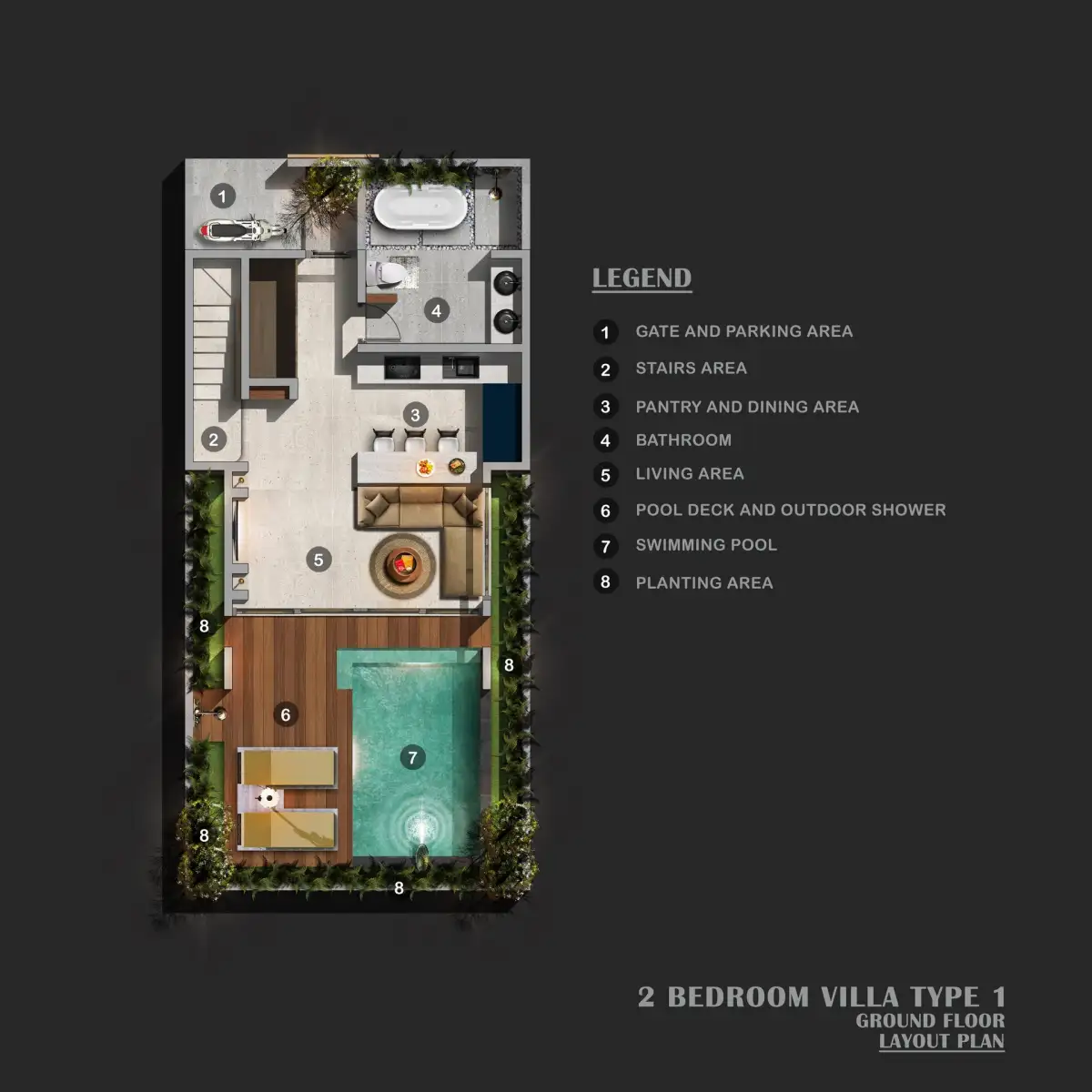 Vila je navržena v elegantním moderním stylu s důrazem na čisté linie, praktické dispoziční řešení a komfort každodenního bydlení. Nabízí dvě samostatné ložnice, prostorný obývací prostor s kuchyňským koutem, soukromý bazén a moderní smart home technologie. Nemovitost se prodává kompletně zařízená, včetně veškerého nábytku a spotřebičů, a je připravena k okamžitému užívání či pronájmu.
