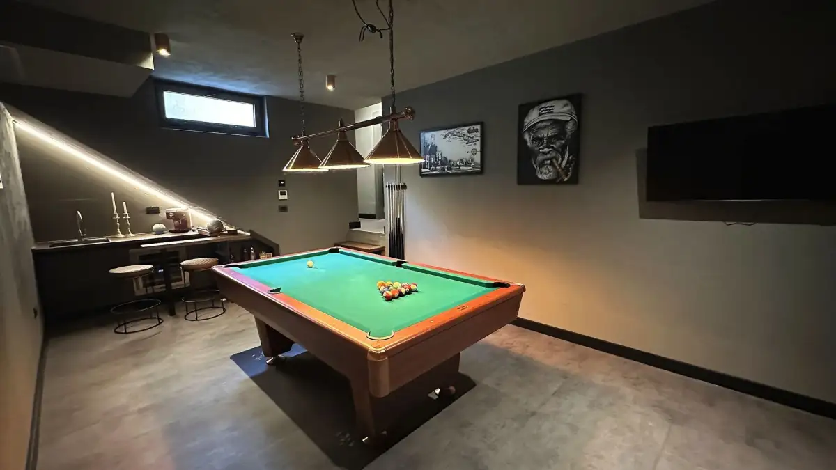 Druhou obytnou část představuje samostatná menší budova, ve které se nachází apartmán s plně vybavenou kuchyní, obývacím pokojem a koupelnou. V suterénu tohoto objektu se nachází bar s kuchyní, samostatná toaleta a herna – ideální pro zábavu a relaxaci hostů.