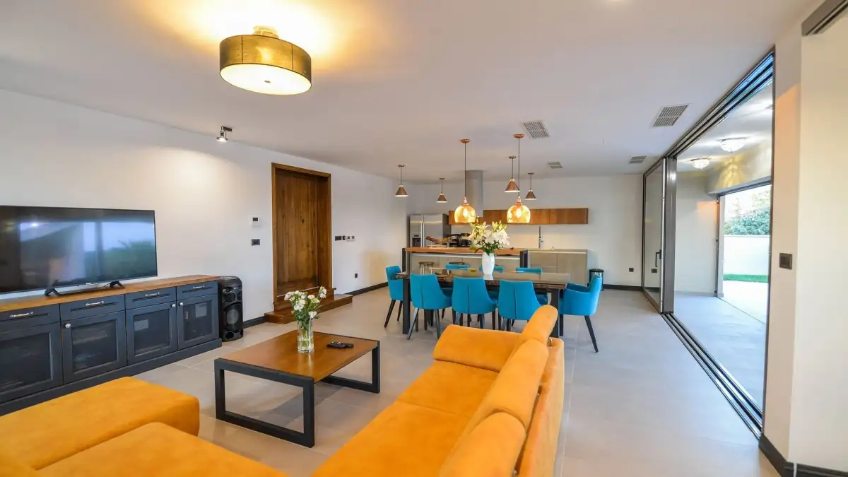 Hlavní obytnou část tvoří elegantní vila s prostorným interiérem, ve kterém se nacházejí tři ložnice, pět koupelen, moderně vybavená posilovna, relaxační sauna a vířivka. Centrem exteriéru je soukromý bazén obklopený sluneční terasou a venkovním krbem – ideální prostor pro odpočinek i společenské chvíle.