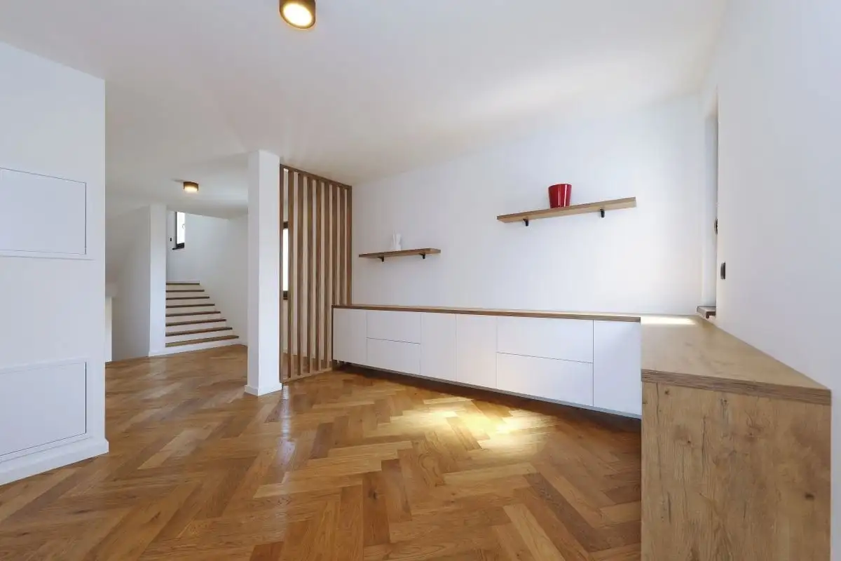 Při výstavbě byly použity nejkvalitnější materiály, interiér i nábytek jsou sladěny v nadčasovém stylu s důrazem na detaily a komfort. Každá místnost je vybavena podlahovým vytápěním a klimatizací, což zaručuje pohodlí po celý rok. Venkovní parkování pojme více vozidel a v dvojgaráži je dostatek prostoru pro další dvě auta.