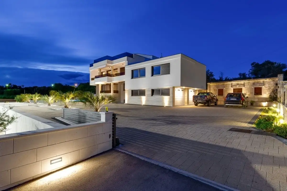 V podzemním podlaží se nachází stylová taverna s vnitřním kamenným grilem, která v sobě spojuje kouzlo tradiční dalmatské architektury s moderní elegancí. Tento prostor je ideálním místem pro odpočinek, degustace či společenské večery s přáteli. Hlavní podlaží tvoří vstupní hala, koupelna a tři moderně zařízené ložnice. V prvním patře se rozprostírá otevřený koncept obývacího pokoje, jídelny a kuchyně, doplněný o dvě ložnice, dvě koupelny a úložný prostor. Z tohoto patra vede přímý vstup na střešní terasu, odkud se otevírá úchvatný panoramatický výhled na moře, okolní ostrovy i město Zadar.