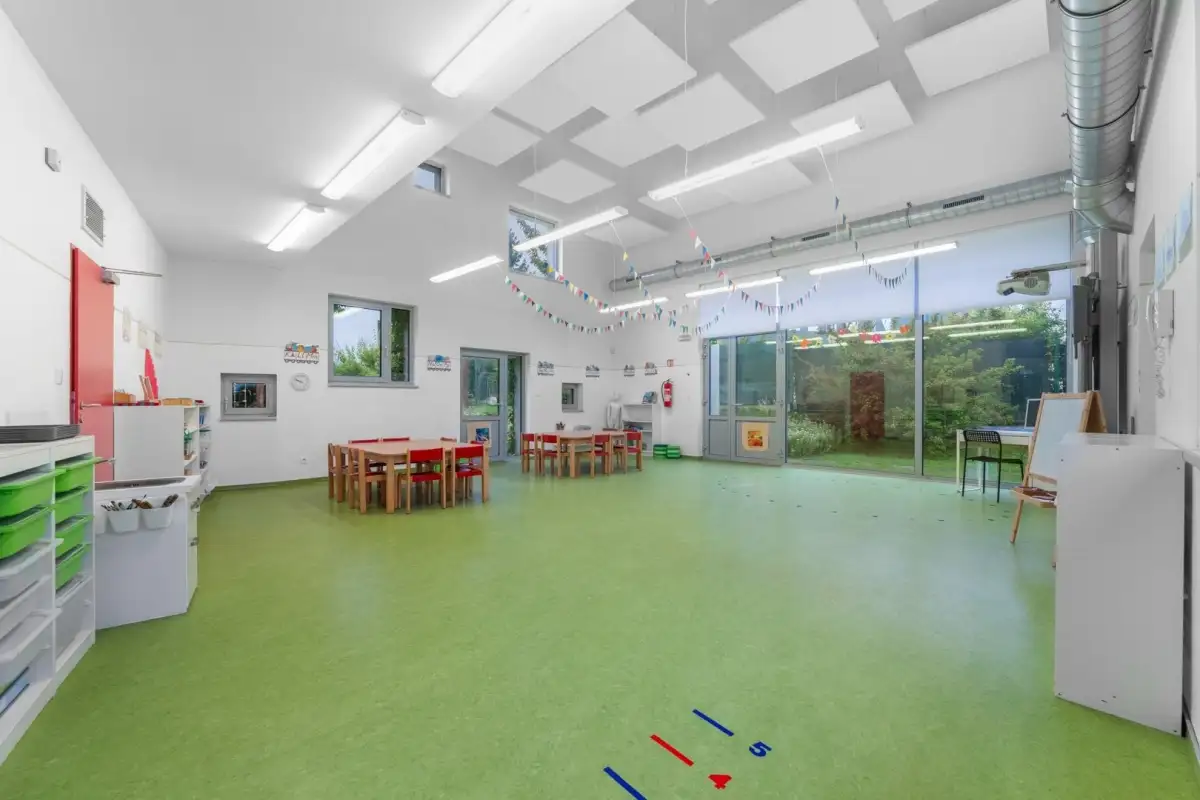 Interiér školky je pečlivě navržen pro potřeby malých dětí i personálu – v přízemí jsou vybudované dvě prostorné třídy (63 m² a 45 m²), navazující zázemí v podobě dětské umývárny, toalet, šaten, přípravny pokrmů, skladů a prostor pro zaměstnance. Celý provoz propojuje centrální vstupní hala, která vytváří přirozený komunikační uzel.