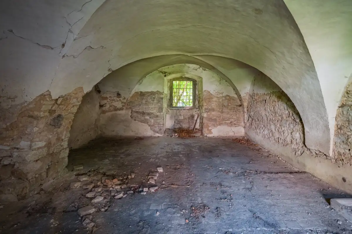 Průjezd vchodu do zámku a místnosti v přízemí severního křídla jsou zaklenuty valenou klenbou. V malých místnostech při průjezdu vpravo bývala vrátnice a šatlava. Dle popisu z roku 1663 bylo v přízemí osm místností včetně dosud dobře zachované unikátní černé kuchyně a v podzemí tři klenuté sklepy. Dosud je přístupná podzemní lednice, kde se celoročně uchovával led k chlazení potravin. V patře byla předsíň, komnata a komora, světnice s komorou, kabinet, velká jídelna a kaple Sv. Kříže, jenž stavebně předstupuje z fasády. Štukové stropy zdobila fresková malba. Za jídelnou zůstalo ještě několik nedokončených a nezařízených světnic. Pod šindelovou střechou bylo devět místností pro čeleď.