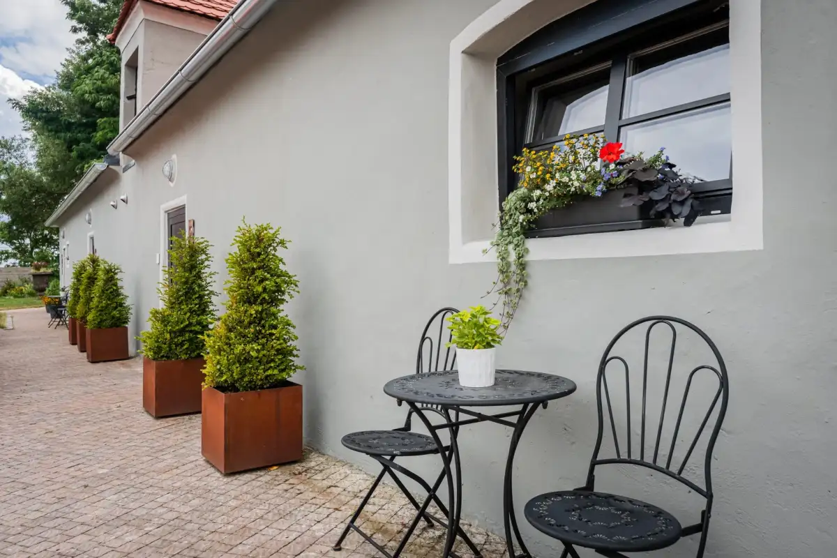 Bývalá zámecká kočárovna nyní slouží jako prostorná garáž pro čtyři vozy. Naproti se nachází zámecká maštal, přetvořená na dva samostatné butikové hostinské apartmány, každý s vlastní koupelnou. Nechybí ani samostatná toaleta se sprchou pro návštěvníky venkovních prostor.