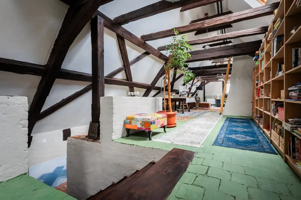 Z haly v patře vede schodiště do rozlehlého podkroví (125 m²) koncipovaného jako otevřený prostor. Přiznaný barokní krov dosahující výšky 6 metrů v hřebeni vytváří dechberoucí atmosféru. Prostor je plně zateplený, vytápěný a v letních měsících klimatizovaný. Může sloužit jako impozantní pracovna, ateliér, herna nebo exkluzivní odpočinková zóna, nebo je varianta poměrně jednoduchého rozdělením na další dva pokoje/ložnice se zázemím.