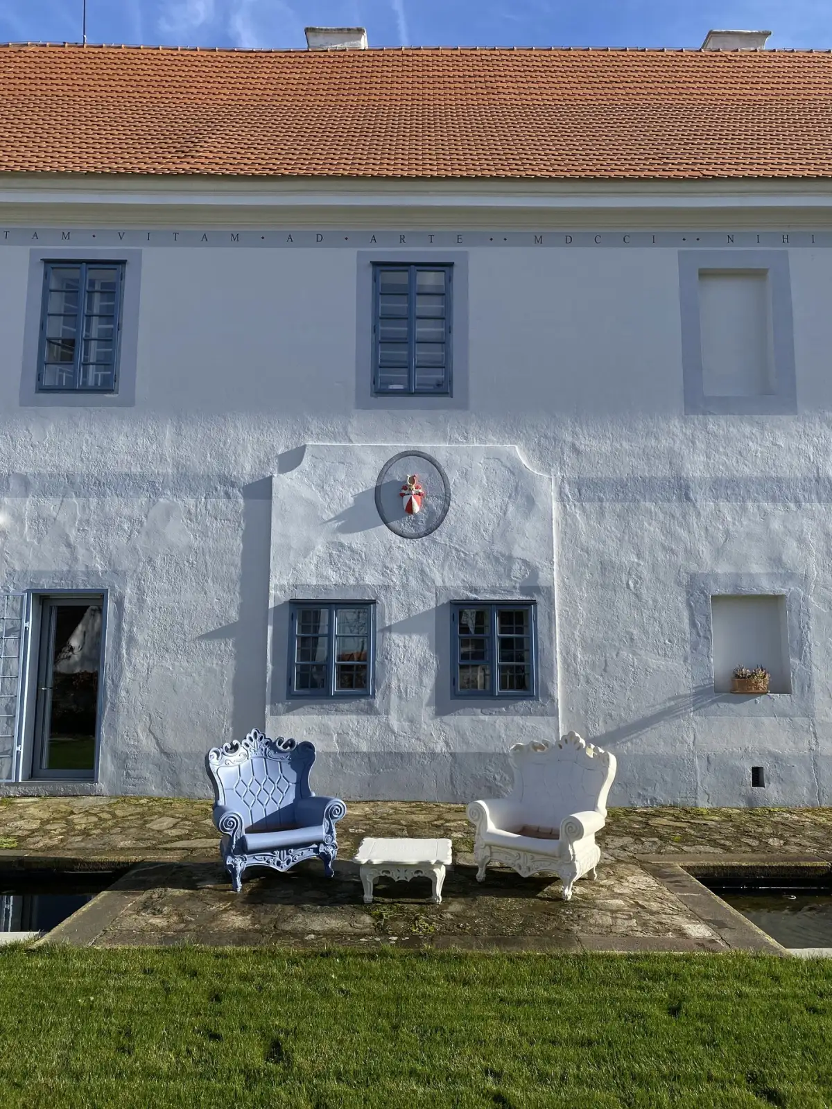 Areál je majestátně ohraničen masivní kamennou zdí, která mu dodává soukromí a exkluzivitu. Vjezd do zámeckého nádvoří střeží impozantní automatická kovová brána. Přední část pozemku tvoří elegantní formální. U zámecké stodoly se nachází keramický bazén s automatikou a protiproudem pro Budovami obklopené nádvoří s ústřední ocelovou plastikou plynule přechází v komorní park obklopující zarybněný rybník, lemovaný vzrostlými stromy, s molem a stylovým posezením u ohniště s grilem.