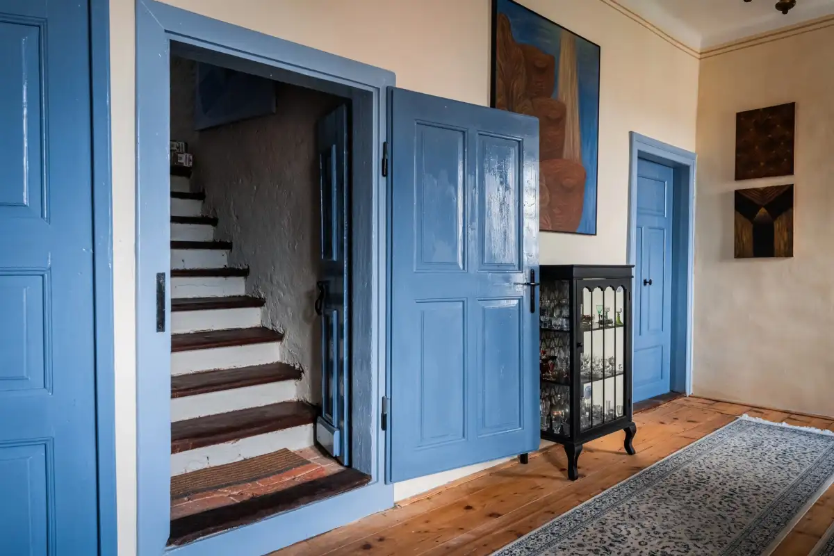 Vstupní část hlavní zámecké budovy tvoří prosklené zádveří s historizujícími bezpečnostními dveřmi vedoucími do reprezentativní haly. Odtud se sestupuje do autentického gotického sklepa zaklenutým valenou klenbou. Vlevo od vstupní haly se nachází nejstarší část zámku, gotický sál s působivým krbem. Vpravo pak objevíte prostornou jídelnu a velkoryse řešenou kuchyni s dominantním ostrovem z brazilské žuly. Ve stejném křídle je situována knihovna a plně vybavená prádelna. Přízemí o rozloze 170 m² pokrývá spárovaná historická cihelná dlažba s komfortním podlahovým vytápěním.