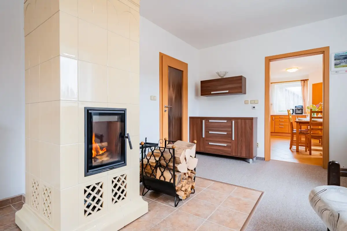 Dvoupodlažní objekt (dispozice 5+1) nabízí podlahovou plochu 151 m², garáž 32 m² a půdní úložný prostor 20 m². Dispozice umožňuje pohodlné rozdělení na soukromé i společné zóny, ideální pro ubytování menších skupin, firemních týmů nebo hostů. V přízemí se nachází zádveří, hala, plně vybavená kuchyně s jídelním koutem, světlý obývací prostor s krbovými kachlovými kamny, samostatná místnost vhodná např. jako kancelář nebo zázemí pro personál a toaleta. Podkroví nabízí tři ložnice, šatnu/komoru a moderní koupelnu s vanou, sprchovým koutem, umyvadlem a toaletou.