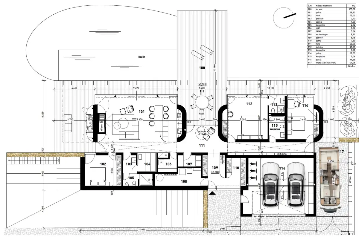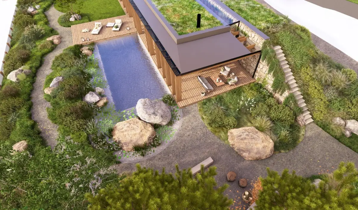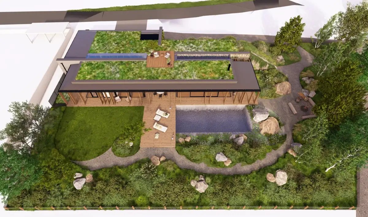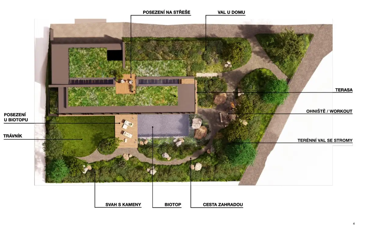 Součástí nabídky je schválený projekt pro solitérní rodinný dům určený k trvalému bydlení. Architektonické řešení reflektuje nejnovější trendy – dům je navržen jako jednopodlažní objekt s pochozí zelenou střechou a dispozicí 4+kk o celkové ploše 435 m². Součástí je prostorná terasa, sauna, biotop, garáž pro dvě auta a velké kryté parkovací stání.