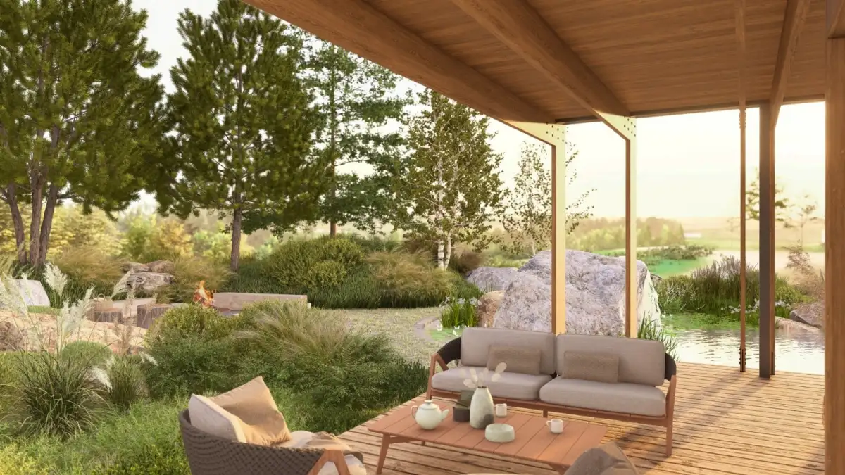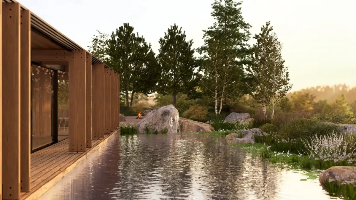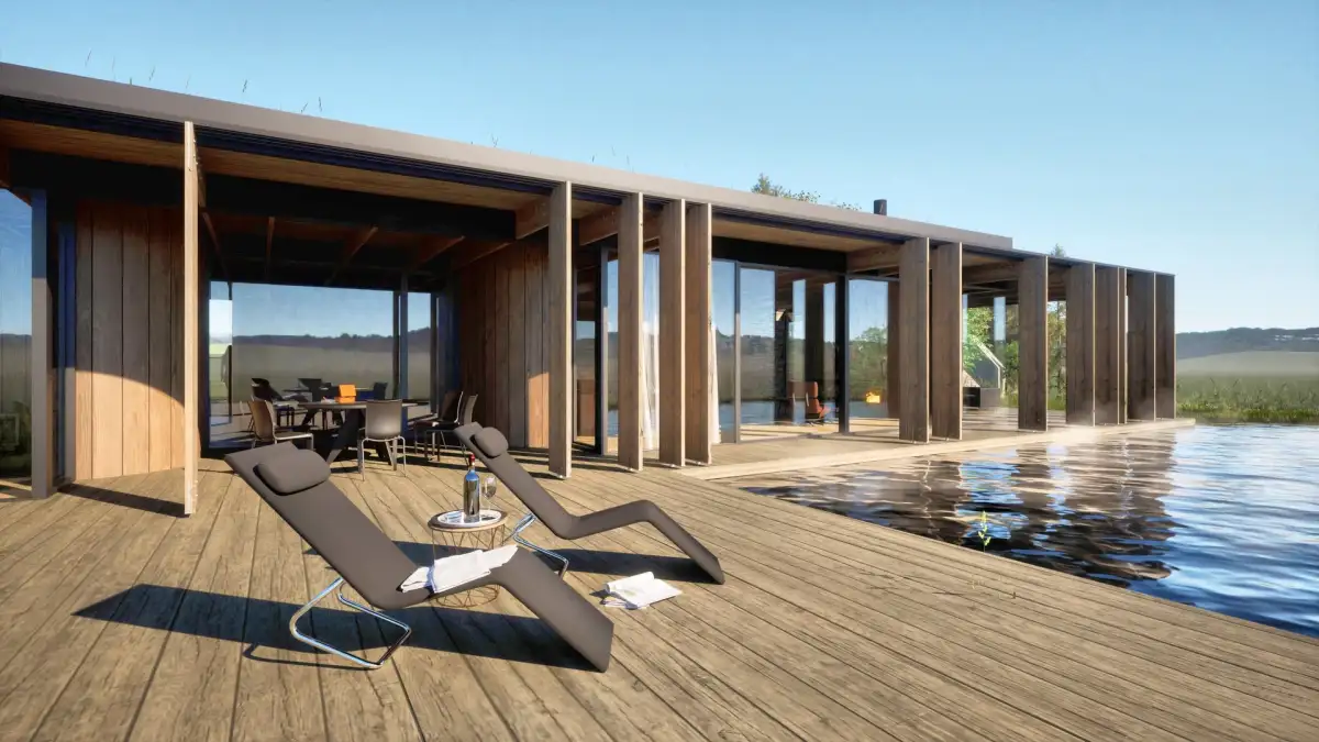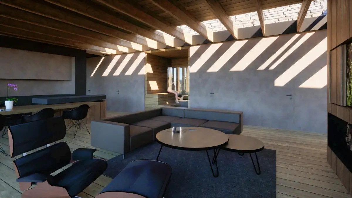 Součástí nabídky je schválený projekt pro solitérní rodinný dům určený k trvalému bydlení. Architektonické řešení reflektuje nejnovější trendy – dům je navržen jako jednopodlažní objekt s pochozí zelenou střechou a dispozicí 4+kk o celkové ploše 435 m². Součástí je prostorná terasa, sauna, biotop, garáž pro dvě auta a velké kryté parkovací stání.