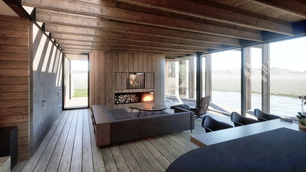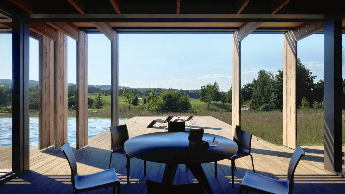 Stavba kombinuje zděnou technologii s ocelovými prvky, fasády využívají přírodní kámen a dřevo. Západní prosklená fasáda propojuje interiér s exteriérem a je chráněna vertikálními dřevěnými lamelami, které zároveň reflektují estetiku golfové klubovny. Součástí domu je tepelné čerpadlo, extenzivní vegetační střecha a řešení důrazu na udržitelnost a komfort. Pozemek má zajištěné napojení na obecní vodovod a elektro přípojku. Bližší informace a možnosti poskytneme na vyžádání.