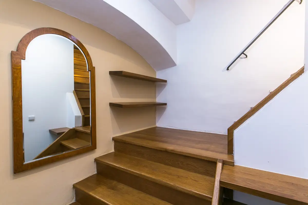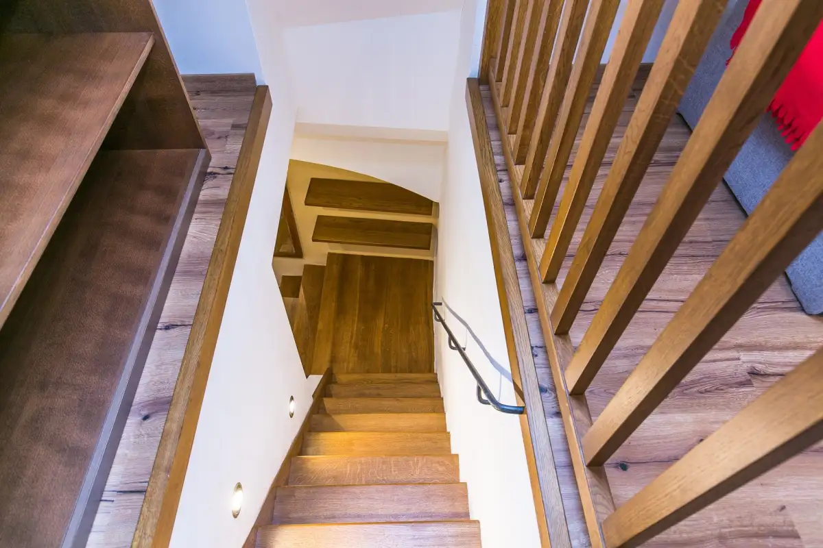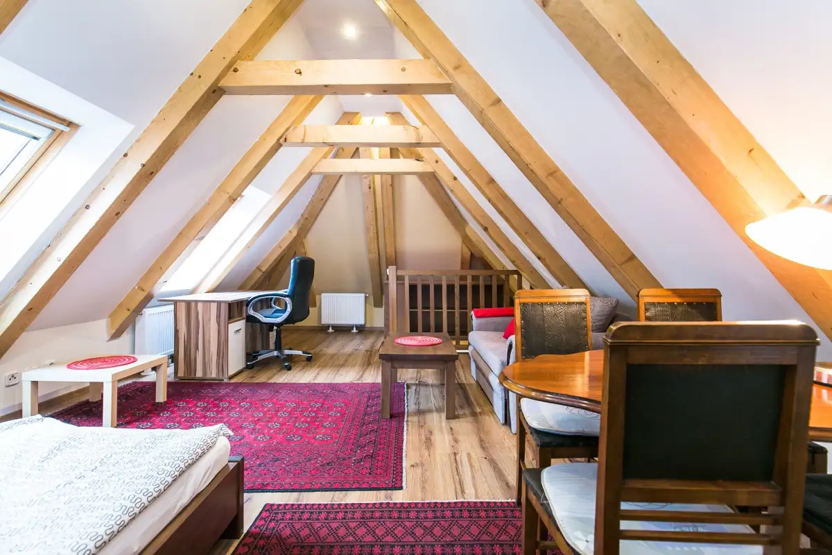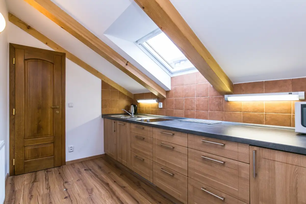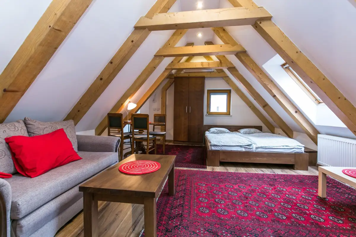 Dispozice zahrnují vstupní chodbu, prostorný pokoj s manželskou postelí, pohovkou, jídelním a pracovním stolem, moderní kuchyň (indukční varná deska, lednice, myčka, mikrovlnná trouba) a koupelnu se sprchovým koutem a toaletou. Historický dům z roku 1586 je zapsaný jako kulturní památka s množstvím originálních prvků. Objekt byl přestavěn barokně na konci 17. století. Úprava vnitřních dispozic a fasáda je provedena klasicistním stylem z 1. čtvrtletí 19. století.