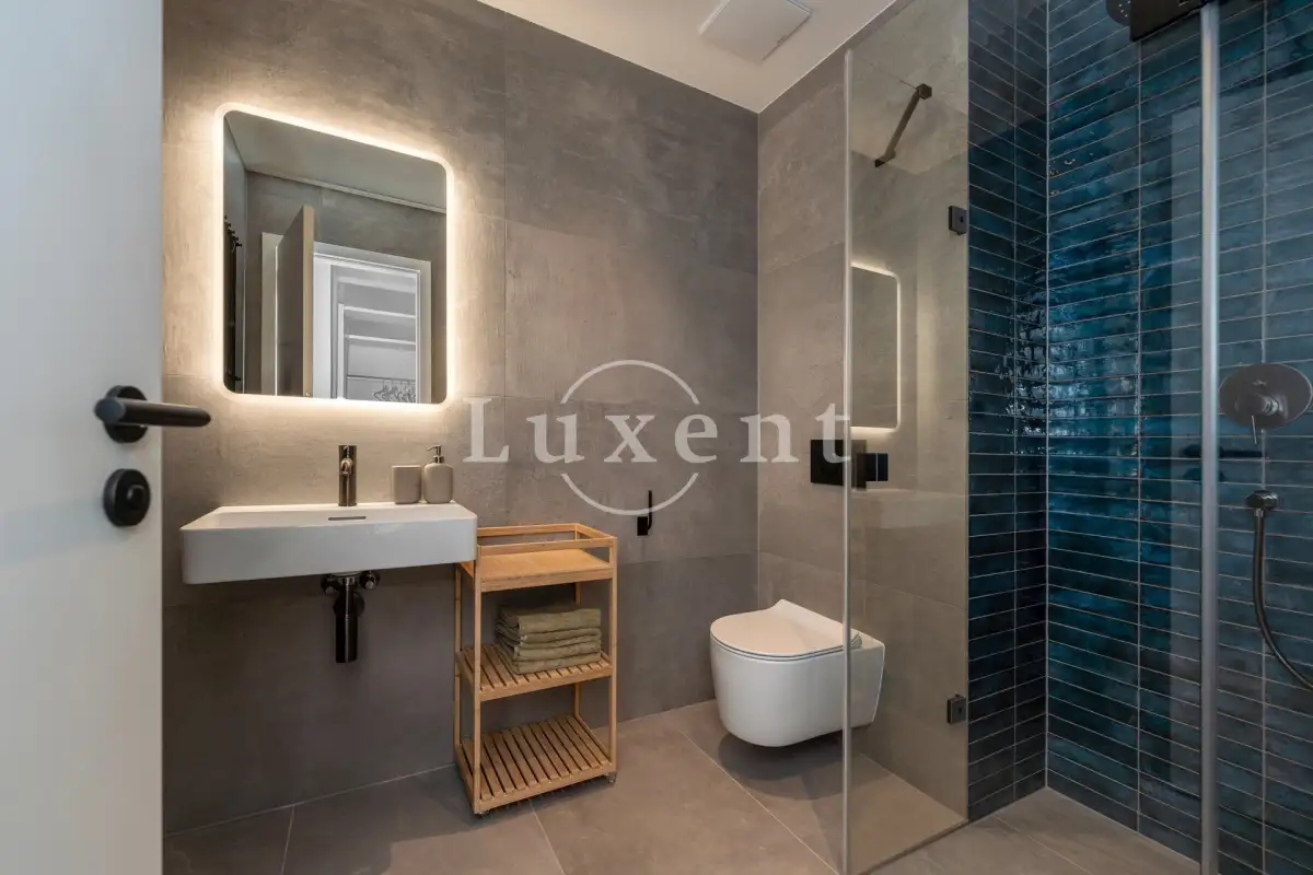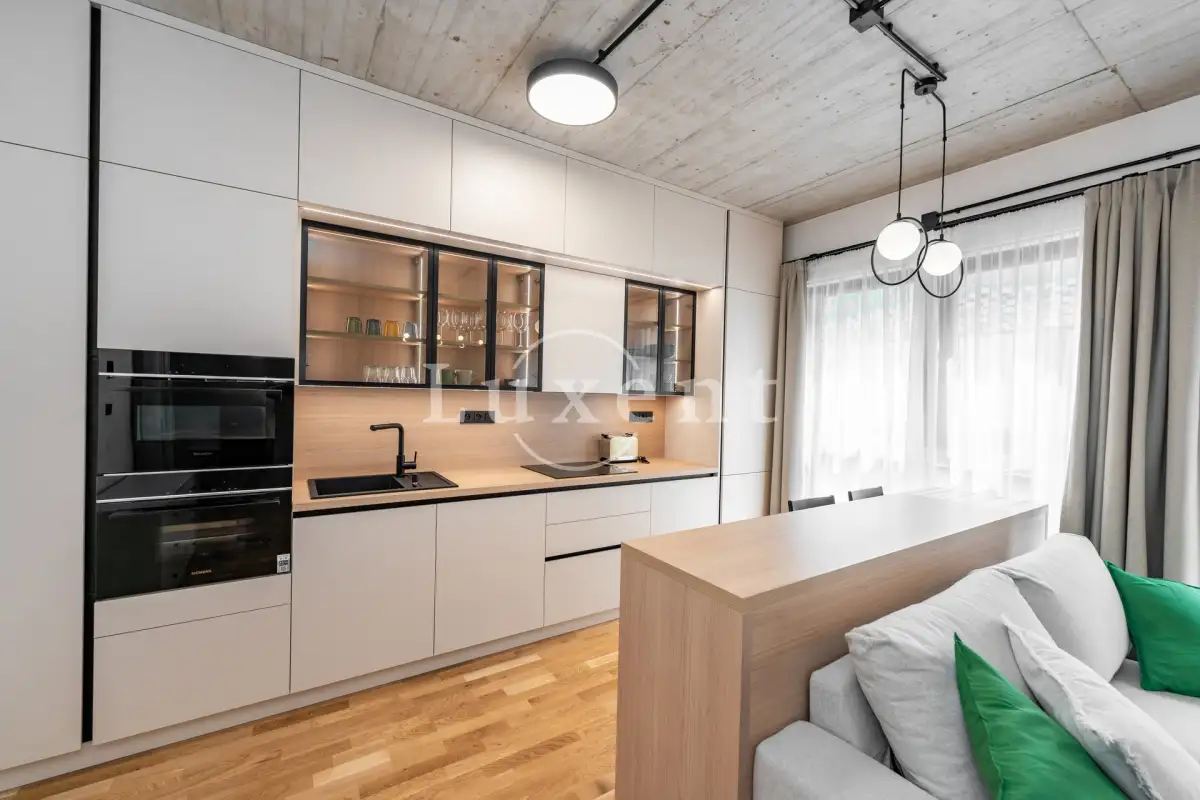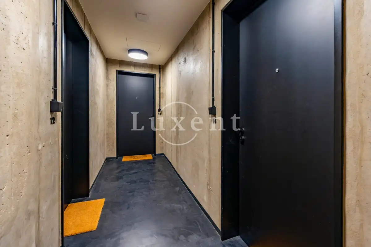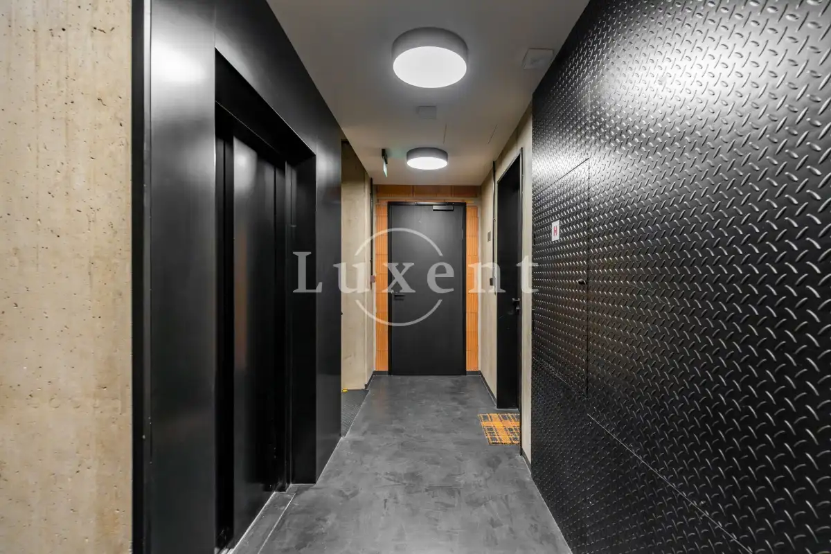 Originálně řešená dispozice designového bytu tvoří vstupní předsíň, vzdušný obývací pokoj s kuchyňským koutem a barovým pultem, který odděluje kuchyň od obývacího pokoje. Součástí obývacího pokoje je i nápaditě začleněný prostor na spaní s úložným místem. Dále prostorná koupelna se sprchovým koutem walk-in, umyvadlem a toaletou. Kuchyň je vybavená veškerými moderními spotřebiči Siemens, pračkou, ale také nádobím.