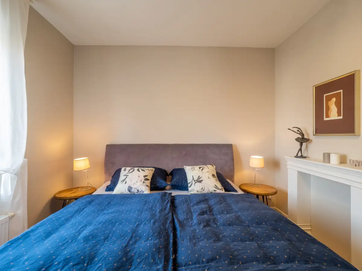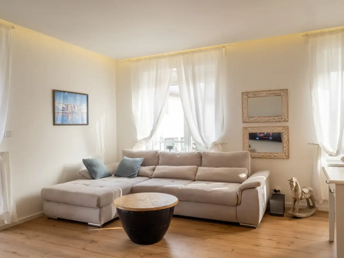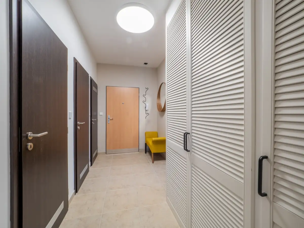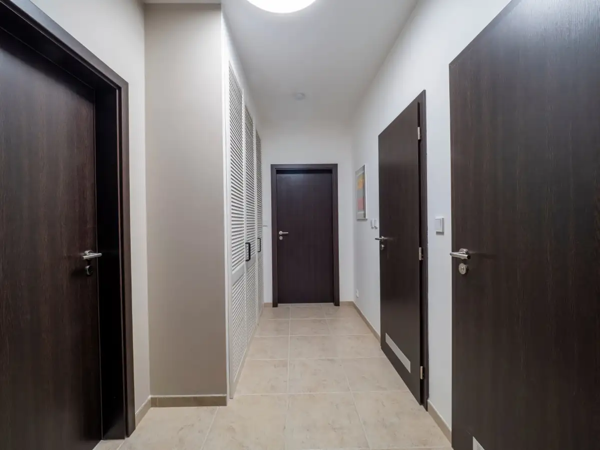 Dispozice bytu zahrnují prostornou obývací místnost s pohodlnou sedací soupravou, jídelním stolem, barovým pultem a kompletně vybaveným kuchyňským koutem všemi spotřebiči, ložnici s manželskou postelí, vlastní šatnou a dalším vestavěným úložným prostorem, koupelnu se sprchovým koutem, oddělenou toaletu a komoru s pračkou. Součástí vstupní chodby jsou vestavěné skříně na míru. Všechna okna jsou vybavena předokenními elektrickými roletami na dálkové ovládání. K bytu náleží jedno garážové stání a sklep.